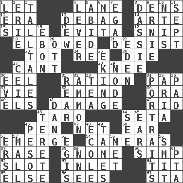 ACROSS 1. Allow 4. Unable to walk 8. Habitations of wild animals 12. Period 13. Debunk (Brit. slang) 14. Johnson of "Laugh-In" 15. Filth; sediment 17. Webber/Rice musical 18. Clip 19. Shoved, as through a crowd 21. Stop 23. Small child 24. To sift 26. Expire 27. Patter 28. Leg joint 30. Snakelike fish 31. Food allowance for one day 34. Infant food 37. Compete 38. Make improvements or corrections to 39. Mouth or opening 40. Raised railways 41. Break 42. To free from 43. Edible starchy tuberous root 44. Bristle 46. Writing instrument 47. Fish or hair follower 50. Ewer handle 51. Develop 54. Devices for capturing images 57. To erase 58. Dwarf 60. Simple or foolish person 62. Groove 63. An arm off of a larger body of water 64. Teat (slang) 65. Otherwise 66. Observes 67. R.R. building DOWN 1. French article 2. 4th largest of the Great Lakes 3. Baron Munchausen's specialties 4. Prying instrument 5. Stay 6. Floor covering 7. Mild oath 8. Hyrax 9. Bert's buddy 10. Nuclear Threat Initiatives 11. Back-to-school mo. 13. Morning condensation 16. Inky black, to poets 20. Baseball player Mel 22. Locale of original sin 25. Supplementing with great effort 27. To provide with a ceiling 29. Connecting point 30. First lady 31. Located in or toward the back 32. ID or VA city 33. Beverage made from leaves 34. Likenesses of persons 35. Operatic vocal solo 36. Groovy apt. 41. Mild oath, euphamism for damn 43. Cigar-shaped 44. Perceive with the eye 45. Hearing organs 46. Mexican monetary units 48. Learning spot: Fr. 49. Domesticates 51. Celtic language 52. Promenade 53. Armor plate that protects the chest 55. Was introduced to 56. Stricken, poetically 59. Compass dir. 61. Parent Teacher Assoc.