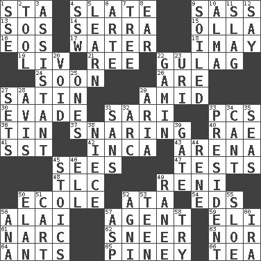 ACROSS 1. R.R. building 4. Chalkboard 9. Backtalk 13. Mayday 14. Father Junipero _ 15. Spanish pot 16. Greek goddess of the dawn 17. Wetness 18. "If ____ say so..." 19. 54 in ancient Rome 21. Portuguese money of account (variant) 22. POW camp 24. Within a short period 26. "We ___ not amused" (Victoria) 27. Smooth fabric 29. Among 30. Dodge 31. Indian skirt 33. Personal Computers (abbr.) 36. Shallow baking pan 37. Catching in a trap 40. Actress Charlotte 41. Fast jet (abbr.) 42. South American Indian 43. Sports stadium 45. Observes 47. Trials 48. Affectionate concern, for short 49. Painter Guido (1575-1642) 50. Learning spot: Fr. 52. _ moment's notice (2 wds.) 54. Begley and Asner 56. Jai ____ 57. Rep 59. Connecticut Ivy Leaguer 61. Drug cop 62. Scornful expression 63. Or not 64. Pismires 65. Abounding in pines 66. Beverage made from leaves DOWN 1. Compass dir. 2. Utensil 3. Aide 4. Compass dir. 5. Memorize 6. Johnson of "Laugh-In" 7. Woody plant 8. Ewer handle 9. Dirtied 10. _ mater 11. Volcanic refuse 12. Declare 20. Nothingness 22. Homeless child 23. RI univ. 25. Washington bills 27. Puts into a specified state 28. Advice 29. Operatic vocal solo 31. Without 32. Curve 33. Elected leader of a country 34. Patter 35. Oceans 38. Sibling's daughter 39. Yard entry 44. French philosopher Descartes 45. Unemotional ones 46. Pipe bend 49. The wife of a rajah (variant) 50. Flair 51. Heavy open wagon 52. Hindu god of fire 53. Adolescent 55. _ gin 56. Santa ___, CA 57. Cleo's killer 58. Attempt 60. Lyricist Gershwin
