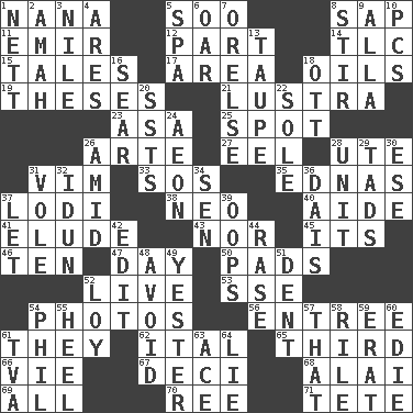 ACROSS 1. Nanny 5. "Barney Miller" actor Jack 8. Plant excrement 11. Independent ruler or chieftain 12. Role in a play 14. Affectionate concern, for short 15. Lies 17. Type of rug 18. Petroleums 19. College papers 21. A period of five years 23. White ___ sheet 25. Specific locale 26. Johnson of "Laugh-In" 27. Snakelike fish 28. Shoshoni 31. Zeal 33. Mayday 35. Ferber et al. 37. Farming town in central California 38. Modern: prefix 40. Helper 41. Evade 43. Not either 45. It is 46. Nine, plus one 47. 24 hours 50. Writing tablets 52. Moving, as bait 53. Compass dir. 54. Pictures 56. Main course 61. Those people 62. Slanted text style (abbr.) 65. One of three equal parts 66. Compete 67. Tenth: prefix 68. Jai ____ 69. 100% 70. Portuguese money of account (variant) 71. False hair DOWN 1. Remaining after all deductions 2. Nursemaid 3. Mediterranean tributary 4. Ancient Greek god of war 5. Health resort 6. Rowing implement 7. Threatening words 8. Agitate 9. Silent film actress Nazimova 10. Personal Computers (abbr.) 13. Grayish beige 16. Wither 18. Baseball player Mel 20. Fast planes 22. Not divided or shared with others 24. Age 26. Among 28. A single undivided whole 29. Bits 30. Compass dir. 31. Short-tailed, large-bodied rat 32. Goddess of spring and wife of Bragi 34. Elected rep. 36. Raised platform 37. Allow 39. I made a mistake 42. Prepare for publication 44. Raze (variant) 48. Prevent the occurrence of 49. Last past 51. Gouge 52. Myrna of the movies 54. Silvers or Donahue 55. Person who is morally reprehensible 57. Not this but _ 58. Cause heat under the collar 59. Part of Q.E.F. 60. Singer Brickell 61. Federal power corp. 63. Adept person 64. Whopper