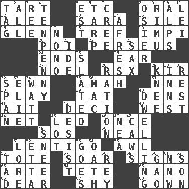 ACROSS 1. Small pie 5. And so on (abbr.) 8. Relating to the mouth 12. Toward shelter 13. "Two Mules for Sister ____" 15. Drop; flow; fall 16. American astronaut and politician John 18. Unclean, religiously 19. Body of Kaffir warriors 20. Luau course 22. Son of Zeus who helped slay Medusa 24. Extremities 26. Hearing organ 27. Christmas carol 28. Acura sports coupe 29. Apertif with cassis 32. Stitched 35. Nursemaid 37. Compass dir. 38. Frolic 39. Make lace 40. Habitations of wild animals 41. Small island 42. Tenth: prefix 43. 270 degrees 44. Fish or hair follower 45. Directed 46. At one time in the past 49. Mayday 50. Actress Patricia 51. Small, flat, pigmented spot on the skin 55. Leather borer 56. Lug 57. Fly high 59. Omens 63. Johnson of "Laugh-In" 64. False hair 65. Billionth: prefix 66. Letter starter 67. Like a shrinking violet 68. Long dress DOWN 1. Label 2. 100% 3. To separate or throw off 4. 3-inch nail 5. Eastern Standard Time (abbr.) 6. Canvas cover 7. Algonquian 8. Flexible twig of a willow tree 9. Tall New Zealand timber tree 10. High mountains 11. Flowery wreath 14. Anew 17. Words to Nanette 21. Binary compound 23. Saxophone 25. Scheduled 28. Food allowance for one day 29. Leg joint 30. Lodging establishments 31. Respite 32. Connect, as a bridge 33. Writer Wiesel 34. Electrical Unit 36. Apple computer (short form) 40. Home 42. Stop 45. Car dealer's back yard 47. Teachers' org. 48. Crow sounds 49. Contemptuous expression 51. Old wives' tales, e.g. 52. Singer James 53. Moves 54. Pledge 56. Bit 58. Marina Del _, California 60. E Mali city 61. Compass dir. 62. Boy, to dad