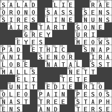 ACROSS 1. First course 6. Whopper 9. Actress Charlotte 12. U. of Maine site 13. Backtalk 14. Elected reps. 15. Founders of families 16. Actor's bit 17. Religious women 18. Wind 19. Small pie 20. Went 21. Jennifer or Joel 23. RI univ. 24. Snake ____ (dice throw) 25. Catcalls? 28. Writing tablet 30. Moral principle 34. Fastener 35. Cuckoo 36. Sir (Sp.) 38. Lyricist Gershwin 39. Ear part 41. Brizilian seaport 43. Fast jet (abbr.) 44. Promenades 46. Remaining after all deductions 48. Connecticut Ivy Leaguer 49. Wig 50. A single undivided whole 51. Singer Brickell 53. River (Sp.) 56. Margarine 57. Ache 58. Mexican monetary units 60. Political cartoonist Thomas 61. Woody plant 62. Staphylococcus 63. Followers of ems 64. Added to 65. Laconic DOWN 1. Distress signal 2. Roberta Peters solo 3. Australian parrot (variant) 4. Disorder of the immune system 5. Two (Sp.) 6. Den 7. Is not 8. Compass dir. 9. One who advocates reunion 10. Queen of England 1702-14 11. Double-curved letter 13. Kill 14. Sounds asleep 19. Trials 20. Chewing product 22. Portuguese money of account (variant) 24. The property of being fit to eat 26. Armed conflicts 27. Petty quarrel 28. Inside of hand 29. Small Philippine buffalo 31. Layer 32. _ tizzy (2 wds.) 33. Small bed 37. Indian princess (variant) 40. American author Paul (1891-1958) 42. Allow 45. Be seated 47. Cigar-shaped 49. Prong on a fork 50. ____ Bator, Mongolia 51. Merit 52. Passed on 54. Austrian river, tributary to the Danube 55. I made a mistake 56. Single 57. Parent Teacher Association (abbr.) 58. Pacific Standard Time (abbr.) 59. A female animal or person