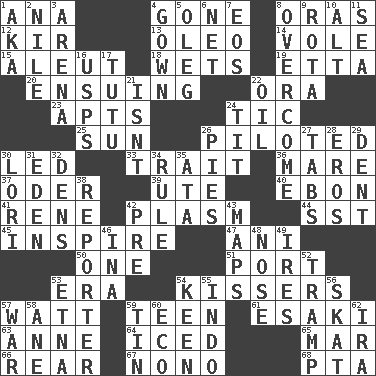 ACROSS 1. Santa ___, CA 4. Went 8. Mouths or openings 12. Apertif with cassis 13. Butter sub 14. Short-tailed, large-bodied rat 15. Native American of Southwest Alaska 18. Moistens 19. Singer James 20. Taking place subsequently 22. Mouth or opening 23. Flats, for short 24. Nervous spasm 25. Player for Phoenix 26. Manned the helm 30. Directed 33. Distinguishing feature 36. Female horse 37. River in Europe 39. Shoshoni 40. Inky black, to poets 41. French philosopher Descartes 42. Suffix with ecto or cyto 44. Fast jet (abbr.) 45. Heighten or intensify 47. Black tropical American cuckoo 50. Single 51. Left side of a ship or aircraft 53. Epoch 54. Smoochers 57. Electrical Unit 59. Adolescent 61. 1973 Nobel Price Winner (Physics) Leo 63. Singer Murray 64. On the rocks 65. Spoil 66. Hitchcock's "____ Window" 67. Words to Nanette 68. Parent Teacher Assoc. DOWN 1. Alias (abbr.) 2. "Death on the ____" 3. Sports stadium 4. Bride's dress 5. Cassini of fashion 6. Fish or hair follower 7. Greek goddess of the dawn 8. Conquer 9. Roll call or roster of names 10. Keyboard modifier key 11. Ocean 16. United States Postal Service (abbr.) 17. Ballerina skirt 21. Is not 22. Lubricate 24. Teat (slang) 26. Sliced desserts 27. Bar bills 28. Greek god of love 29. Gouge 30. Australian parrot (variant) 31. Paradise 32. Cub Scout units 34. General guideline 35. _ moment's notice (2 wds.) 38. Newsperson 42. Before (prefix) 43. Atlas contents 46. _ tizzy (2 wds.) 48. Olfactory organ 49. Angers 52. _____ steamer (cargo ship) 53. Inactive volcano in Sicily 54. Peachy ____! 55. Southeast Asian peninsula 56. Three-handed card game 57. Armed conflict 58. One (Scot) 59. Metal container 60. Environmental prefix 62. Retirement account (abbr.)