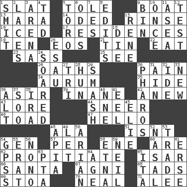 ACROSS 1. Narrow board 5. Lacquered or enameled metalware 9. Water vessel 13. Hindu Mythology: god of death 14. Wrote a lyric poem 15. Wash lightly 16. On the rocks 17. Dwellings 19. Nine, plus one 20. Greek goddess of the dawn 21. Metal container 22. Erode 23. Backtalk 25. Observe 26. Curses 30. Ache 34. Gold (Symbol: Au) 35. Flintstone garb 36. SW Saudi Arabia district 39. Lacking in sense or substance 42. Afresh 43. Old wives' tales, e.g. 44. Contemptuous expression 46. Frog relative 47. Phone greeting 48. Wing 51. Is not 54. Commissioned military rank (abbr.) 57. For each 58. Compass dir. 60. "We ___ not amused" (Victoria) 62. Conciliate 65. Austrian river, tributary to the Danube 66. Before Barbara or Clara 67. Hindu god of fire 68. Bits 69. Portico 70. Anneal 71. Toward shelter DOWN 1. Stricken, poetically 2. Shoestrings 3. Sports stadium 4. Small amount or degree 5. "Corrida" creature 6. Lyric poems 7. French article 8. Prepares for publication 9. Storage container 10. Single time 11. Toward the sea 12. Trial 15. French philosopher Descartes 18. Expire 20. Son of Isaac 24. Flew 27. Three (prefix) 28. Attila the _ 29. Box-office sellout 30. N Egypt peninsula 31. The 18th letter of the Arabic alphabet 32. Binary compound 33. ___ Haven, CT 36. The first octave above the treble staff 37. "Barney Miller" actor Jack 38. Retirement account (abbr.) 40. Compass dir. 41. Snakelike fish 45. Writer Wiesel 48. Capital of Western Samoa 49. Allow 50. Believer in; advocate of (suffix) 52. Relating to the nose 53. Buy and sell 54. Global Positioning Systems (abbr.) 55. Part of Q.E.F. 56. Words to Nanette 58. Inactive volcano in Sicily 59. Famous astronaut Armstrong 61. Celtic language 63. Parent Teacher Association (abbr.) 64. Ripen 65. Call ___ day