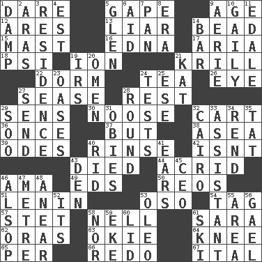 ACROSS 1. Have the gumption 5. Yawn 9. Ripen 12. Ancient Greek god of war 13. One who doesn't tell the truth 14. Necklace unit 15. Vertical spar for supporting sails 16. Pulitzer Prize-winning author Ferber 17. Roberta Peters solo 18. Air pressure measure (abbr.) 19. Electrically charged atom 21. The principal food of baleen whales 22. Dormintory (informal) 24. Beverage made from leaves 26. Sight organ 27. Gospel singer Marvin 28. Relief 29. Elected reps. 30. Trap for birds or small mammals 32. Draw slowly or heavily 36. Single time 37. With the exception that 38. Toward the sea 39. Lyric poems 40. Remove soap 42. Is not 43. Passed on 44. Sour-tasting 46. Housemaid (var.) 49. Begley and Asner 50. Vintage cars 51. Soviet premier 1918-24 53. Bear (Spanish) 54. Label 57. Proofreading order 58. 1994 drama film starring Jodie Foster 61. "Two Mules for Sister ____" 62. Mouths or openings 63. Migrant worker of the '30s 64. Leg joint 65. For each 66. Make new 67. Slanted text style (abbr.) DOWN 1. Moist 2. Ancient river in northeast Turkey 3. Home 4. Eastern Standard Time (abbr.) 5. Small, secluded valley 6. Assist 7. Baking dish 8. Epoch 9. Nest on high 10. Lightheartedly 11. Peak District village in England 14. Drinking establishment 19. Big collection agency 20. Sign of something about to happen 21. Krazy ___ of comics 23. Fertile tracts in a desert 24. Trials 25. Compass dir. 27. Post 28. Having a circular shape 29. "Barney Miller" actor Jack 31. Off-Broadway awards 32. Capital of Egypt 33. Helper 34. Tear apart 35. Make lace 40. To free from 41. Hearing organs 43. Lair 45. Corporate head (abbr.) 46. Columnist Joseph or Stewart 47. Distance measurement (Brit.) 48. Approach 52. ___ a Wonderful Life 53. Butter sub 55. Length times width 56. Highlander 58. And not 59. Make supply last 60. Hat (slang) 61. What Jean-Claude Killy likes to do