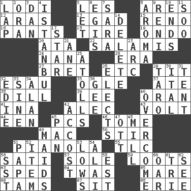 ACROSS 1. Farming town in central California 5. French article 8. Ancient Greek god of war 12. Caspian sea tributary 13. Mild oath 15. Western Nevada city 16. Leg coverings 18. Hoop that covers a wheel 19. Southwest Nigerian state 20. _ moment's notice (2 wds.) 22. Deli grouping 24. Grandmother 26. Period 27. Cy Young winner Saberhagen 28. And so on (abbr.) 29. Teat (slang) 32. He sold his birthright 35. Stare 37. Had dinner 38. Deli pickle 39. Area sheltered from the wind 40. Northwest Algerian city 41. _ tizzy (2 wds.) 42. Actor Baldwin 43. Electrical Unit 44. Car or cant ending 45. Personal Computers (abbr.) 46. Heavy book 49. Apple computer (short form) 50. Use a spoon 51. Player piano 55. Affectionate concern, for short 56. Suttee (variant) 57. Not divided or shared with others 59. Plunders 63. Moved rapidly 64. It was, poetically 65. Female horse 66. Scottish caps 67. Be seated 68. 4th largest of the Great Lakes DOWN 1. Pet locale 2. Mouth or opening 3. Daniel's nick name 4. Byzantium, centuries later 5. Allow 6. Armor plate that protects the chest 7. "Two Mules for Sister ____" 8. Scent 9. Painter Guido (1575-1642) 10. Conclusions 11. "Barney Miller" actor Jack 14. Erase 17. Play the lead 21. One (Scot) 23. Curve 25. Ringlike coral islands and reefs 28. Opts 29. Pacific island yam 30. Slanted text style (abbr.) 31. Portable shelter 32. Singer Brickell 33. Trig term 34. Actor Alda or Thicke 36. Turn to the right 40. Conquer 42. Buttonhole 45. Baking dish 47. Baseball player Mel 48. Place where flour is made 49. Unmarried girls 51. Dad 52. A distinct part 53. Coldest temperatures 54. Mountain range southwest of Kyrgyzstan 56. Fast jet (abbr.) 58. Eastern Standard Time (abbr.) 60. Rowing implement 61. Three (prefix) 62. Observe