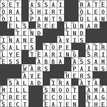 ACROSS 1. Arrange properly for use 4. Slender Brazilian palm 9. Pace 13. Mouth or opening 14. Chest covering 15. Margarine 16. Lubricate 17. Leg coverings 18. Uhlan (variant) 19. Raised railways 21. To sift 22. Type of eclipse 24. Look after 26. Indiana (abbr.) 27. Lacking in sense or substance 29. Advice 30. Table seasonings 31. Drink excessively 33. Wind 36. Potassium hydroxide 37. Separating forcefully 40. _ Lanka 41. Double-curved letter 42. Swedish rock group 43. Indian state 45. Armed conflicts 47. Aches 48. "___ Maria" 49. Possessive pronoun 50. First course 52. Lyricist Gershwin 54. _ moment's notice (2 wds.) 56. Place where flour is made 57. Snout, nose 59. Nanny (var.) 61. Woody plant 62. Learning spot: Fr. 63. Tired old horse 64. Religious group 65. Consumed 66. Definite Article DOWN 1. "Barney Miller" actor Jack 2. 4th largest of the Great Lakes 3. Baron Munchausen's specialties 4. Viper 5. Broken piece 6. Trig term 7. Johnson of "Laugh-In" 8. ___ a Wonderful Life 9. Periods in a boxing match 10. Silent film actress Nazimova 11. Pull apart 12. Age 20. Emitted 22. Make or become more lively 23. University (slang) 25. Egg locale 27. Small island 28. Negative votes 29. Capital of Western Samoa 31. Bar bills 32. Globe 33. Aide 34. SW Asia republic 35. Basketball hoops 38. Having ears or earlike features 39. Stare wonderingly 44. "Two Mules for Sister ____" 45. Place for singles 46. Actress Gardner 49. White Person, in Hawaii 50. Title for a man of rank and authority 51. Actor Baldwin 52. South American Indian 53. Carrot, for example 55. Nursemaid 56. Mountains (abbr.) 57. Observe 58. "___ Little Indians" 60. Ripen