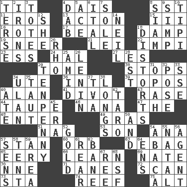 ACROSS 1. Teat (slang) 4. Raised platform 8. Fast jet (abbr.) 11. Greek god of love 13. NE Massachussets city 15. One more than two 16. Writer of Portnoy's Complaint (1969) 17. Calif. Air Force Base 18. Moist 19. Scornful expression 21. Luau accessory 22. Body of Kaffir warriors 23. Double-curved letter 24. Actor Linden 27. French article 29. Heavy book 30. Discontinues 34. Shoshoni 36. International (abbr.) 39. Literary convention 40. ____ Jay Lerner 41. A piece of turf (Scot.) 43. Raze (variant) 44. Grayish beige 46. Nanny 47. Definite Article 48. Keyboard key 49. Pate de foie ____ 51. Tired old horse 53. Manchild 54. Santa ___, CA 57. Comedian Laurel of Laurel & Hardy 60. Globe 63. Debunk (Brit. slang) 65. Suggestive of the supernatural 66. Memorize 69. Nathan's nickname 70. Compass dir. 71. Natives or inhabitants of Denmark 72. Skim 73. R.R. building 74. Coral ridge 75. The first octave above the treble staff DOWN 1. Laconic 2. Removes the wrinkles 3. Lugs 4. Small moist lump or mass 5. Adept person 6. Slanted text style (abbr.) 7. Not divided or shared with others 8. Thailand, formerly 9. Simple or foolish person 10. Native american tent (variation) 12. A female animal or person 14. Famous astronaut Armstrong 18. What propaganda does 20. 17th letter of the Greek alphabet 25. Among 26. Soviet premier 1918-24 28. Eastern Standard Time (abbr.) 29. 3-inch nail 31. Brightly colored fish 32. Airs 33. Compass dir. 34. ____ Bator, Mongolia 35. Pulled tight 37. Federal power corp. 38. Yearns 40. Had dinner 42. Pacific island yam 45. Epoch 50. Added to 52. Gilt 54. Phillipine bananalike plant 55. Brizilian seaport 56. Rep 57. Elected reps. 58. Portable shelter 59. Length times width 61. Located in or toward the back 62. Object of repulsion 64. Followers of ems 67. Portuguese money of account (variant) 68. Overdraft (abbr.)