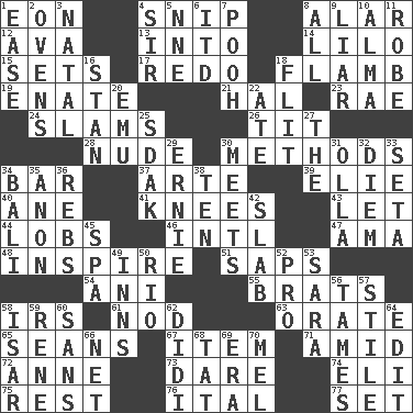ACROSS 1. Age 4. Clip 8. Having or resembling wings 12. Actress Gardner 13. To the inside or interior of 14. _ and Stitch 15. Puts into a specified state 17. Do over again 18. Flambe (short form) 19. Related on the mother's side 21. Actor Linden 23. Actress Charlotte 24. Shuts with force 26. Teat (slang) 28. Naked 30. Modes 34. Drinking establishment 37. Johnson of "Laugh-In" 39. Writer Wiesel 40. A saturated hydrocarbon 41. Leg joints 43. Allow 44. Tennis shots 46. International (abbr.) 47. Nursemaid (var.) 48. Heighten or intensify 51. Plant excrements 54. Black tropical American cuckoo 55. Naughty children 58. Big collection agency 61. Lower and raise head in agreement 63. Declaim 65. Seines 67. A whole individual unit 71. Among 72. Queen of England 1702-14 73. Have the gumption 74. Connecticut Ivy Leaguer 75. State of inaction 76. Slanted text style (abbr.) 77. Arrange properly for use DOWN 1. Relaxation 2. Baking chambers 3. Brizilian seaport 4. Title for a knight 5. Compass dir. 6. It would 7. "Silly old bear" 8. Everything 9. One who doesn't tell the truth 10. _ mater 11. Loose flowing garment 16. Comedian Laurel of Laurel & Hardy 18. Secret move to avoid paying debts 20. Australian flightless bird 22. Had dinner 25. Neighbor of Neb. 27. Definite Article 29. Bert's buddy 30. Confronts 31. Water jar 32. South Vietnam president (1954) 33. Stalk of a moss capsule 34. Indonesian resort city 35. At once, immediately (arch.) 36. Confederate soldiers (slang) 38. Nine, plus one 42. Broad, flat, thick piece 45. Health resort 49. Restaurants 50. _ de Janeiro 52. Adept person 53. "Two Mules for Sister ____" 56. Corrects by punishment or discipline 57. Vertical member of a panel or frame 58. Austrian river, tributary to the Danube 59. French philosopher Descartes 60. Without 62. "You Light Up My Life" star Conn 64. Prepare for publication 66. Fish or hair follower 68. Make lace 69. Epoch 70. Cartoonist voice _ Blanc