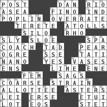 ACROSS 1. Mail 5. One of the 12 tribes of Israel 8. _ de Janeiro 11. At sea 12. Fine (Spanish) 13. Indiana (abbr.) 14. Cotton for raincoats, e.g. 17. Make much ado about nothing 19. Cigar-shaped 21. Ringlike coral islands and reefs 22. Grain storage tower 23. 17th letter of the Greek alphabet 24. Secret 27. _ gin 29. Health resort 32. Team commander 34. Small amount or degree 36. Lightbulb-shaped fruit 37. Legendary monster 38. Compass dir. 39. Jacques of French films 40. Billionth: prefix 41. It is so 42. Flower holders 43. Followers of ems 44. Welles in "The Third Man" 46. Compass dir. 47. Opposite of masc. 50. Droops 52. Unrefined 55. Put through a sieve 57. One to whom something is allotted 59. Michaelmas daisies 62. Luau accessory 63. Celtic language 64. Needle holder 65. Car dealer's back yard 66. Greek goddess of the dawn 67. Proofreading order DOWN 1. Infant food 2. Bear (Spanish) 3. Back-to-school mo. 4. Lies 5. HTML Container Element 6. Approach 7. Compass direction 8. Monetary unit of Yemen 9. International (abbr.) 10. Lyric poems 12. Enemy 15. From or relating to Ireland 16. 1994 drama film starring Jodie Foster 18. Friend of Pooh 20. Tootsie (variant) 24. Biscuitlike quick bread 25. Utah city north of Ogden 26. Entertaining tales 28. Artist's stand 29. Gospel singer Marvin 30. Eucharist need 31. Get up 33. Corporate head (abbr.) 35. Stop 36. Parent Teacher Assoc. 42. Viva Las _ 45. Hindu Mythology: god of death 47. From 48. First name in cosmetics 49. Paris' subway 51. Settings 52. Give a ring to 53. Butter sub 54. Came down and settled, as after flight 55. Perceive with the eye 56. Remaining after all deductions 58. Double-curved letter 60. Sorrow 61. Be seated