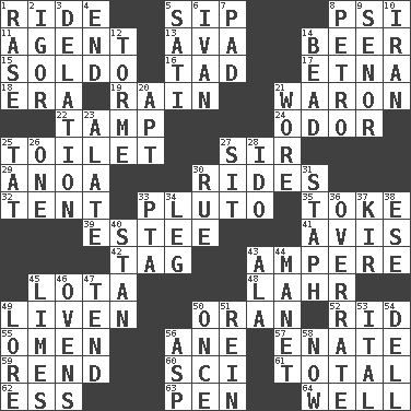 ACROSS 1. Travel on an animal 5. Small drink 8. Air pressure measure (abbr.) 11. Representative 13. Actress Gardner 14. Fermented drink made from hops 15. Twentieth part of a lira 16. Small boy 17. Inactive volcano in Sicily 18. Epoch 19. Precipitation 21. Make _____ (do battle with) 22. Pack (down) 24. Scent 25. Bathroom plumbing fixture 27. Title for a knight 29. Small Philippine buffalo 30. Amusement-park features 32. Portable shelter 33. Greek god of the underworld 35. Puff or smoke 39. First name in cosmetics 41. Deliberation 42. Label 43. Electrical Unit 45. Globular water bottle used in Asia 48. Cowardly lion portrayer 49. Make or become more lively 50. Northwest Algerian city 52. To free from 55. Presage 56. A saturated hydrocarbon 57. Related on the mother's side 59. Tear apart 60. _-fi 61. Add up to 62. Curvy letter 63. Animal enclosure 64. Water source DOWN 1. To erase 2. Russian composer Stravinsky 3. Conveyance 4. Conclude 5. Suttee (variant) 6. _ the terrible 7. Groovy apt. 8. Stone: prefix 9. Sir (Sp.) 10. SW Asia republic 12. Singer Mel 14. Necklace unit 20. Fitting 21. Had on 23. Having winglike extensions 25. Make lace 26. Single 27. Be seated 28. Wedding promise 30. Sorrow 31. Staphylococcus 33. Parent Teacher Assoc. 34. Part of a journey 36. Make much ado about nothing 37. Apertif with cassis 38. Compass dir. 40. Comedian Laurel of Laurel & Hardy 43. Wing 44. French painter Edouard 45. Citrus fruits 46. Baking chambers 47. Watch over 49. Old wives' tales, e.g. 50. Single time 51. It's straight from the horse's mouth 53. Slanted text style (abbr.) 54. Small valley 56. Viper 58. Immediately