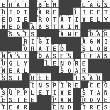 ACROSS 1. Part of Q.E.F. 5. Benjamin's nick name 8. Falls behind 12. "You Light Up My Life" star Conn 13. "We ___ not amused" (Victoria) 14. It is permitted: Lat. 15. Singer Brickell 16. Rotating or pertaining to rotation 19. Modern: prefix 20. Refrain by choice 21. Fast planes 23. One (Scot) 24. Rowing implement 27. Swiss mountan, "Queen of the Mountains" 30. Hindu god of fire 31. Spoke pompously 34. Messy guy 35. Political cartoonist Thomas 38. Fertile tracts in a desert 40. Beverages made from leaves 41. Unsightly 42. Poe poem 44. Actress Patricia 45. Fly high 46. Fast jet (abbr.) 47. To sift 50. Russian ruler of old 53. Heighten or intensify 57. Corporate head (abbr.) 59. Supplementary 63. Comedian Laurel of Laurel & Hardy 64. First name in cosmetics 65. Baking dish 66. Be footloose 67. Separate forcefully 68. Conclude 69. Angers DOWN 1. Genesis locale 2. Amusement-park features 3. Goodbye (Sp.) 4. Make a knot 5. Sharp remark 6. Greek god of love 7. Remaining after all deductions 8. 54 in ancient Rome 9. Adept person 10. Set 11. Filthy place 14. Actor's bit 17. Auto club (abbr.) 18. Metal container 20. SW Saudi Arabia district 22. Trinitrotoluene 24. Stare 25. Small Philippine buffalo 26. Chest bones 28. E Mali city 29. Slanted text style (abbr.) 30. Michaelmas daisies 32. Compass dir. 33. Cub Scout units 35. Religious women 36. Eons 37. Narrow board 39. "Barney Miller" actor Jack 43. Pace 47. Cause heat under the collar 48. Compass dir. 49. Eastern Standard Time (abbr.) 51. Thespian 52. Rob, plunder, or pillage 54. Corncob 55. _ the terrible 56. Tear apart 58. Singles 59. Put into a specified state 60. Purpose 61. Parent Teacher Association (abbr.) 62. For each 63. _ Lanka