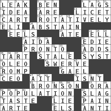 ACROSS 1. Path through which fluid escapes 5. Benjamin's nick name 8. Fails to keep up a pace 12. The main thing one is thinking about 13. "We ___ not amused" (Victoria) 14. It is permitted: Lat. 15. Haul 16. Rotating or pertaining to rotation 19. Connecticut Ivy Leaguer 20. Choose not to consume 21. Snakelike fish 23. Had dinner 24. Pipe bend 27. Opera by Verdi 30. Singer Brickell 31. Right away 34. Sums up 35. Small pie 38. Having lost freshness 40. System (abbr.) 41. Margarine 42. Turn aside suddenly 44. Play 45. Highlander 46. Corporate head (abbr.) 47. Small island 50. Is not 53. "Death Wish" actor 57. Mouth or opening 59. Census information 63. Volcanic refuse 64. Clothes sense 65. Falsehood 66. Ache 67. Johnson of "Laugh-In" 68. Raised railways 69. Against DOWN 1. Louse (plural) 2. Peak District village in England 3. Nest on high 4. Krazy ___ of comics 5. Sharp remark 6. Greek god of love 7. Remaining after all deductions 8. 54 in ancient Rome 9. Adept person 10. Set 11. Filthy place 14. Actor's bit 17. American Automobile Association (abbr.) 18. Teat (slang) 20. SW Saudi Arabia district 22. Portable computer 24. Whirlpool 25. Hats (slang) 26. For fear that 28. Two (Sp.) 29. Pismires 30. Artist's stands 32. The 23rd letter of the Hebrew alphabet 33. Cassini of fashion 35. Torque (variant) 36. Medicinal plant 37. San ____ (Riviera town) 39. Period 43. Distinctive style or manner 47. Competent 48. Lyricist Gershwin 49. Small child 51. Pitcher Ryan 52. Distinguishing feature 54. "Death on the ____" 55. Land 56. Washington bills 58. Hindu god of fire 59. Parent Teacher Assoc. 60. Boat paddle 61. Pacific Standard Time (abbr.) 62. Shoshoni 63. Health resort