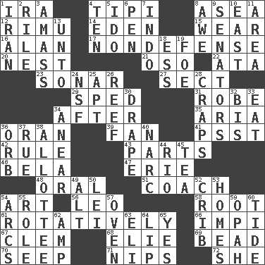ACROSS 1. Retirement account (abbr.) 4. Native american tent (variation) 8. At sea 12. Tall New Zealand timber tree 14. Paradise 15. Erode 16. ____ Jay Lerner 17. Unrelated to defense, as in spending 20. A home for chicks 21. Bear (Spanish) 22. "One Day ___ Time" 23. Underwater navigation system 27. Religious group 29. Broke a traffic law 31. Loose flowing garment 34. Following 35. Operatic vocal solo 36. Northwest Algerian city 39. Avid follower 41. Inconspicuous attention getter 42. Court order 43. Actors' quests 46. Actor Lugosi 47. One of the Great Lakes 48. Taken by mouth 51. Team commander 54. Tate display 56. Lion 58. Carrot, for example 61. Happening in regular succession 66. Body of Kaffir warriors 67. Clement's nick name 68. Writer Wiesel 69. Necklace unit 70. Ooze 71. Pinches, bites 72. A female animal or person DOWN 1. SW Asia republic 2. Cause heat under the collar 3. Collect or gather 4. Nine, plus one 5. Wedding promise 6. Animal enclosure 7. _ china 8. Deep reverence 9. Elected representatives 10. 90 degrees 11. Type of rug 13. To (old English) 18. Double-curved letter 19. Enemy 24. Science/research agcy. 25. Fitting 26. Coral ridge 28. Dice game 30. Window treatment 32. Altar cloth linen 33. Erode 34. Approach 36. Globe 37. Regret 38. One to whom something is allotted 40. Drug cop 44. _ de Janeiro 45. Beverage made from leaves 49. Keyboard modifier key 50. Luau accessory 52. Baby bed with high sides 53. Dwellings 54. Arches 55. Hero or heavy, e.g. 57. Baking chamber 59. Brightly colored fish 60. Periodic rise and fall of the sea level 62. Electrical Unit 63. Connecticut Ivy Leaguer 64. Mouth edge 65. Affirmative reply