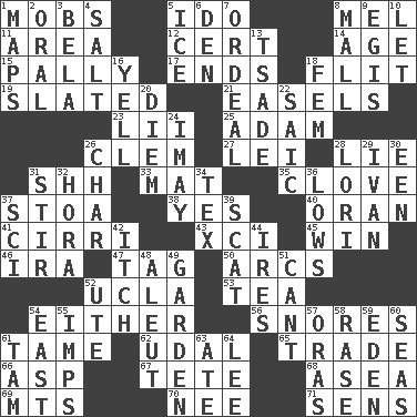 ACROSS 1. Disorderly crowds 5. Wedding promise 8. Cartoonist voice _ Blanc 11. Type of rug 12. Foregone conclusion 14. Grow older 15. Chummy 17. Conclusions 18. Secret move to avoid paying debts 19. Scheduled 21. Artist's stands 23. Cards in a Roman deck? 25. First man 26. Clement's nick name 27. Luau accessory 28. Untruth 31. Quiet! 33. Floor covering 35. Garlic unit 37. Portico 38. Affirmative reply 40. Northwest Algerian city 41. High-altitude cloud 43. One more than ninety 45. Acquire through effort 46. Retirement account (abbr.) 47. Label 50. Curves 52. Southern CA. univ. 53. Beverage made from leaves 54. One or the other 56. Sounds asleep 61. Docile 62. Hereditary estate 65. Exchange 66. Cleo's killer 67. Wig 68. At sea 69. Mountains (abbr.) 70. Born 71. Elected reps. DOWN 1. Atlas contents 2. Taken by mouth 3. Actor Lugosi 4. Table seasoning 5. Frozen water 6. Lair 7. Severe or trying experience 8. Shopping center 9. Armor plate that protects the chest 10. Allow 13. Sadhe (variant) 16. Shout 18. Opposite of masc. 20. South Vietnam president (1954) 22. Ketch in the Levant 24. "If ____ say so..." 26. Burn to charcoal 28. Australian parrot (variant) 29. _ the terrible 30. Car or cant ending 31. Use a swizzle stick 32. Israeli folk dance 34. John Ritter's dad 36. Coldest temperatures 37. _-fi 39. Go away! 42. Hankering 44. Angers 48. Native American of Southwest Alaska 49. Place where plants grow 51. Patter 52. Shoshoni 54. Compass direction 55. Naughty children 57. Mouths or openings 58. Raze (variant) 59. Paradise 60. Oceans 61. Scottish cap 63. Had dinner 64. Area sheltered from the wind