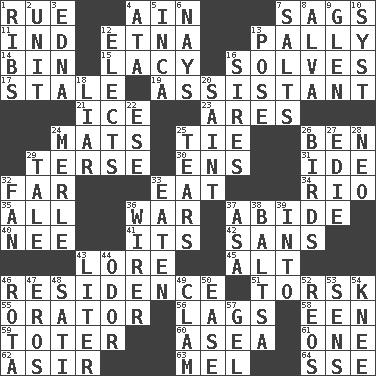 ACROSS 1. Sorrow 4. The 18th letter of the Arabic alphabet 7. Sinks 11. Working for oneself (abbr.) 12. Inactive volcano in Sicily 13. Friendly 14. Storage container 15. Made of lace 16. Finds the solution 17. Lacking originality or spontaneity 19. Helper 21. Frozen water 23. Ancient Greek god of war 24. Floor protectors 25. Make a knot 26. Benjamin's nick name 29. Laconic 30. Followers of ems 31. Binary compound 32. At a great distance 33. Erode 34. _ de Janeiro 35. 100% 36. Armed conflict 37. Tolerate 40. Born 41. It is 42. Without 43. Old wives' tales, e.g. 45. Keyboard modifier key 46. Dwelling 51. Cod relative 55. Speaker 56. Falls behind 58. Car or cant ending 59. Carrier 60. At sea 61. Single 62. SW Saudi Arabia district 63. Cartoonist voice _ Blanc 64. Compass dir. DOWN 1. Teases 2. A single undivided whole 3. Pulitzer Prize-winning author Ferber 4. _ moment's notice (2 wds.) 5. South American Indian 6. Negative votes 7. Table seasonings 8. Inventor's middle name 9. Small, secluded valley 10. System (abbr.) 12. Chooses 13. Airs 16. Founders of families 18. One who doesn't tell the truth 20. Inhabitant of Heaven 22. Compass dir. 24. Haggard of country music 25. Rends 26. Avian creatures 27. Singer Brickell 28. Modern: prefix 29. Story 32. Avid follower 33. Consumed 36. One who wires 37. White ___ sheet 38. Greek mezzo-soprano Agnes 39. To the inside or interior of 43. 61 cubic inches 44. Aroma 46. Roll call or roster of names 47. Greek god of love 48. Suttee (variant) 49. Dollar (slang) 50. Relaxation 52. Vintage cars 53. Elected reps. 54. Leg joint 57. Set