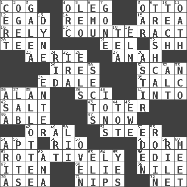 ACROSS 1. Gear tooth 4. Cassini of fashion 8. Von Bismarck 12. Mild oath 14. San ____ (Riviera town) 15. Length times width 16. Have confidence or faith in 17. Act in opposition 20. Adolescent 21. Snakelike fish 22. Quiet! 23. Nest on high 27. Housemaid 29. Angers 31. Skim 34. Peak District village in England 35. Baby powder 36. Actor Alda or Thicke 39. _-fi 41. To the inside or interior of 42. Table seasoning 43. Carrier 46. Competent 47. Overwhelm 48. Taken by mouth 51. Guide 54. Fitting 56. River (Sp.) 58. Dormintory (informal) 61. Happening in regular succession 66. Singer Brickell 67. Detail 68. Writer Wiesel 69. The longest river in the world 70. Toward the sea 71. Cuts off 72. Fish or hair follower DOWN 1. Certainty 2. Double curve, resembling the letter S 3. An organ shaped like a helmet 4. The grampus (Milton) 5. Lion 6. Australian flightless bird 7. Went 8. Rowing implement 9. File 13 10. Technician 11. Pledge 13. Centimeter-gram-second unit of force 18. Afternoon social gathering 19. Shade tree 24. To free from 25. Retirement account (abbr.) 26. Snakelike fish 28. Moving or stirring 30. Religious groups 32. Keyboard modifier key 33. Non-commissioned officer (abbr.) 34. Keyboard key 36. White ___ sheet 37. Experiment locale 38. One to whom something is allotted 40. Charged particles 44. Small child 45. She-sheep 49. Nonscientific branch of learning 50. Cards in a Roman deck? 52. Genesis locale 53. "The Thinker" sculptor 54. Roberta Peters solo 55. Plant holders 57. Baking chamber 59. Cause heat under the collar 60. Rendezvous 62. Nursemaid (var.) 63. Connecticut Ivy Leaguer 64. Mouth edge 65. It is so