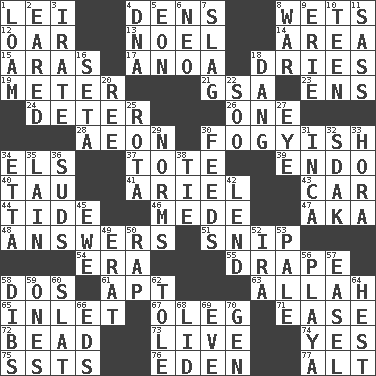 ACROSS 1. Flowery wreath 4. Cub Scout units 8. Moistens 12. Rowing implement 13. Christmas carol 14. Type of rug 15. Ancient river in northeast Turkey 17. Small Philippine buffalo 18. Frees from moisture 19. Distance measurement 21. Girls' org. (abbr.) 23. Followers of ems 24. Prevent from occurring 26. Single 28. Period of immesurable duration 30. Out of fashion; old fashioned 34. Raised railways 37. Lug 39. Inside; within (prefix) 40. The 19th letter of the Greek alphabet 41. Satellite of Uranus 43. Auto 44. Event that recurs at intervals 46. Ancient Persian 47. Alias (abbr.) 48. Replies 51. Sever or remove by pinching or nipping 54. Period 55. Window treatment 58. Two (Sp.) 61. Fitting 63. Assad's deity 65. An arm off of a larger body of water 67. Cassini of fashion 71. Relaxation 72. Necklace unit 73. Moving, as bait 74. Affirmative reply 75. Fast planes 76. Locale of original sin 77. The first octave above the treble staff DOWN 1. Rich soil 2. Having ears or earlike features 3. Feeling or showing extreme anger 4. Heredity factor (abbr.) 5. Age 6. Modern: prefix 7. Volcanic refuse 8. Armed conflict 9. 4th largest of the Great Lakes 10. Adolescent 11. Backtalk 16. Stalk of a moss capsule 18. Mild oath, euphamism for damn 20. Portuguese money of account (variant) 22. "Barney Miller" actor Jack 25. Round or rotation of duties 27. Sight organ 29. Typical models 30. Eats 31. South American Indian 32. Neighbor of Neb. 33. Israeli folk dance 34. Singer James 35. (Had) reclined 36. Beer foam 38. Neckwear 42. Grant temporary use of 45. She-sheep 49. Part of Q.E.F. 50. Strike 52. Lyricist Gershwin 53. Diluted with white 56. Beach, in Buenos Aires 57. Artist's stand 58. Claim 59. Singles 60. Narrow board 62. Lacquered or enameled metalware 64. Command 66. Begley and Asner 68. Flaplike covering 69. First lady 70. Commissioned mil. rank