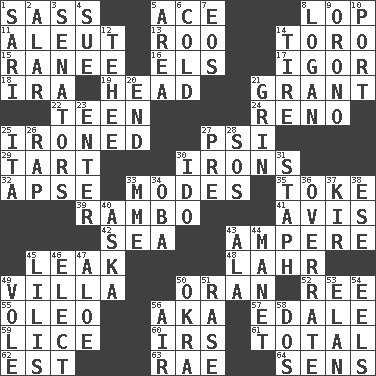 ACROSS 1. Backtalk 5. Adept person 8. Trim (branches) 11. Native American of Southwest Alaska 13. Friend of Pooh 14. "Corrida" creature 15. The wife of a rajah (variant) 16. Raised railways 17. Composer Stravinsky 18. Retirement account (abbr.) 19. Froth on beer 21. Monetary aid 22. Adolescent 24. Former U.S. Attorney General Janet 25. Pressed 27. 23rd letter of the Greek alphabet 29. Small pie 30. Metal shackles 32. Domed church section 33. Methods 35. Puff or smoke 39. Role for Stallone 41. Opinion 42. Ocean 43. Electrical Unit 45. Path through which fluid escapes 48. Cowardly lion portrayer 49. Country estate 50. NW Algerian seaport 52. To separate or throw off 55. Margarine 56. Alias (abbr.) 57. Peak District village in England 59. Louse (plural) 60. Big collection agency 61. "_____ Recall" 62. Eastern Standard Time (abbr.) 63. Actress Charlotte 64. Elected reps. DOWN 1. Indian skirt 2. Having or resembling wings 3. Legislators 4. Take to court 5. Length times width 6. Chilled 7. Greek goddess of the dawn 8. Utah city north of Ogden 9. U. of Maine site 10. Left side of a ship or aircraft 12. Giggle 14. Become fatigued 20. Conclusion 21. Smile widely 23. Keyboard key 25. Call ___ day 26. Reproach for some lapse or misdeed 27. Before (prefix) 28. Mayday 30. Wedding promise 31. Staphylococcus 33. Madame (abbr.) 34. Chief or king in Benin or Nigeria 36. Make much ado about nothing 37. Apertif with cassis 38. Compass dir. 40. "____ silly question..." 43. Chicken ___ king 44. French painter Edouard 45. Ms. Damita and namesakes 46. Choose 47. Medicinal plant 49. Grand slam 50. Gumbo ingredient 51. Raze (variant) 53. Flair 54. Snakelike fish 56. Wind 58. Two (Sp.)