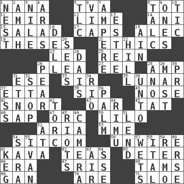 ACROSS 1. Grandmother 5. Federal power corp. 8. Small child 11. Independent ruler or chieftain 12. Welles in "The Third Man" 14. Cuckoo 15. First course 17. Smile enhancers 18. Actor Baldwin 19. College papers 21. Moral principles 23. Directed 25. It's straight from the horse's mouth 26. Entreaty 27. Snakelike fish 28. Electrical Unit 31. Compass dir. 33. Title for a knight 35. Type of eclipse 37. Singer James 38. Small drink 40. Olfactory organ 41. Derisive sound 43. Boat paddle 45. Make lace 46. Plant excrement 47. The grampus (Milton) 50. _ and Stitch 52. Operatic vocal solo 53. Madame (abbr.) 54. "Cheers" or "Ellen" 56. Undo the wiring of 61. Polynesian shrub of the pepper family 62. Afternoon social gatherings 65. Prevent from occurring 66. Epoch 67. Indian titles of respect 68. Scottish caps 69. Separate the seeds from cotton 70. "We ___ not amused" (Victoria) 71. A type of plum DOWN 1. Egg locale 2. Wet nurse 3. Mediterranean tributary 4. Caspian sea tributary 5. Affectionate concern, for short 6. By way of 7. Electrical Unit 8. Baby powder 9. Washington bills 10. Nervous spasm 13. First name in cosmetics 16. Small valley 18. The 18th letter of the Arabic alphabet 20. Observes 22. Land elevation 24. Raised platform 26. Lightbulb-shaped fruit 28. Small Philippine buffalo 29. Vertical spar for supporting sails 30. Before (prefix) 31. Inactive volcano in Sicily 32. Constrict 34. River (Sp.) 36. To (old English) 37. Curvy letter 39. Inside of hand 42. Torque (variant) 44. Tall New Zealand timber tree 48. Disturbances 49. Device for capturing images 51. Grant temporary use of 52. "One Day ___ Time" 54. "Two Mules for Sister ____" 55. _ the terrible 57. Soaks 58. Slanted text style (abbr.) 59. San ____ (Riviera town) 60. Celtic language 61. Cask 63. Wind 64. Compass dir.