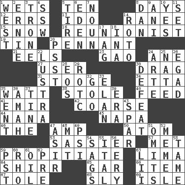 ACROSS 1. Moistens 5. Nine, plus one 8. 24-hour periods 12. Blunders 13. Wedding promise 14. Indian princess (variant) 15. Frozen precipitation 16. One who advocates reunion 19. Shallow baking pan 20. Pre-World Series prize 21. Snakelike fish 23. E Mali city 24. A saturated hydrocarbon 27. One who makes use of a thing 30. To draw with force 31. Moe Howard, for one 34. Singer James 35. Electrical Unit 38. Took without asking 40. Nourish 41. Independent ruler or chieftain 42. Rough 44. Nanny 45. California wine valley 46. Definite Article 47. Electrical Unit 50. Smallest unit of an element 53. More lively and spirited 57. Was introduced to 59. Appease 63. Pale green bean 64. Bake eggs in their shells 65. Slender fish 66. A distinct part 67. Lacquered or enameled metalware 68. Roguish 69. Capri or Wight DOWN 1. 270 degrees 2. Bert's buddy 3. Marketplace scale 4. Compass dir. 5. Become fatigued 6. Locale of original sin 7. Part of speech 8. Daniel's nick name 9. Cuckoo 10. It is so 11. Put into a specified state 14. Printing process, for short 17. Tired old horse 18. _ tizzy (2 wds.) 20. Inconspicuous attention getter 22. A period of five years 24. Johnson of "Laugh-In" 25. Nathan's nickname 26. Mild oath 28. Greek goddess of the dawn 29. College mil. group 30. Outscore 32. Thick or sticky substance 33. Flair 35. Gone 36. Nanny 37. Prong on a fork 39. Period 43. Coast Guard woman 47. SW Saudi Arabia district 48. Floor covering 49. Air pressure measure (abbr.) 51. Leaves out 52. Klaipeda city 54. Settles 55. Slanted text style (abbr.) 56. Suggestive of the supernatural 58. Docile 59. Pacific Standard Time (abbr.) 60. 17th letter of the Greek alphabet 61. Petroleum 62. Before (prefix) 63. Cards in a Roman deck?