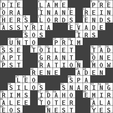 ACROSS 1. Pass on 4. Unable to walk 8. Before (prefix) 11. Mouth or opening 12. Empty; void 14. It's straight from the horse's mouth 15. Possessive pronoun 17. Nobles 18. Extremities 19. Nineveh was its capital 21. Elude 23. Distress signal 24. Big collection agency 25. To (old English) 27. Demure 30. Compass dir. 31. Bathroom plumbing fixture 34. Bit 37. Fitting 38. Let have 39. Single 40. Pacific Standard Time (abbr.) 41. Food allowance for one day 43. Cut the grass 44. French philosopher Descartes 45. An important port of Yemen 47. Lion 49. Health resort 50. Grain storage towers 52. Catching in a trap 56. Basketball hoops 57. Potato state 60. Arab leader 61. Toward shelter 62. Carrier 63. Chicken ___ king 64. Greek goddess of the dawn 65. A home for chicks 66. It is so DOWN 1. Capital of the state of Qatar 2. Angers 3. Hearing organs 4. Ms. Damita and namesakes 5. Small Philippine buffalo 6. Impair 7. Conclude 8. Hangs 9. Travel on or in a vehicle 10. Followers of ems 13. Compass dir. 14. Rump 16. System (abbr.) 20. Carrot, for example 22. Zeal 25. United States Postal Service (abbr.) 26. Remaining after all deductions 27. Food holder 28. Painter Guido (1575-1642) 29. "Tell ____ the Marines!" 30. Plant excrement 32. Legendary monster 33. SW Asia republic 34. Heavy book 35. At once, immediately (arch.) 36. Morning condensation 42. California wine valley 44. Friend of Pooh 46. Have the gumption 47. Citrus fruits 48. Otherwise 49. Derisive sound 50. Grain storage tower 51. Be seated 52. "______ My Girl" (Turtles hit) 53. "If ____ say so..." 54. The longest river in the world 55. Pate de foie ____ 56. Actress Charlotte 58. Spanish title 59. Had dinner