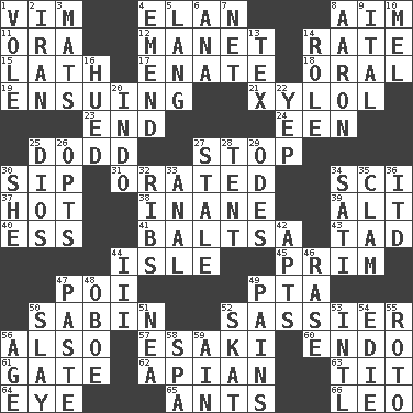 ACROSS 1. Zeal 4. Style 8. Direct toward a target or goal 11. Mouth or opening 12. French painter Edouard 14. Pace 15. Thin strip of wood or metal 17. Related on the mother's side 18. Relating to the mouth 19. Following as a consequence or result 21. Xylene (variant) 23. Conclusion 24. Car or cant ending 25. Texas town _ City 27. Cease 30. Small drink 31. Spoke pompously 34. _-fi 37. Being at a high temperature 38. Empty; void 39. Keyboard modifier key 40. Double-curved letter 41. Greek mezzo-soprano Agnes 43. Small amount or degree 44. Small island 45. Demure 47. Luau course 49. Parent Teacher Assoc. 50. Unit of acoustic absorption 52. More disrespectful 56. In addition 57. 1973 Nobel Price Winner (Physics) Leo 60. Inside; within (prefix) 61. Yard entry 62. Bee-related 63. Teat (slang) 64. Sight organ 65. Pismires 66. Lion DOWN 1. Short-tailed, large-bodied rat 2. SW Asia republic 3. Floor protectors 4. Make improvements or corrections to 5. Long (Scottish) 6. Santa ___, CA 7. Fish or hair follower 8. Composer Copland 9. Slanted text style (abbr.) 10. Cartoonist voice _ Blanc 13. John Ritter's dad 14. Hero or heavy, e.g. 16. Became colored 20. _ china 22. Slangy assent 25. "Vaya con ____" 26. Elects 27. Having lost freshness 28. Portable shelter 29. Lyric poems 30. A female animal or person 32. Chest bones 33. Of or related to the anus 34. Suttee (variant) 35. Dollar (slang) 36. It would 42. Tenement units (abbr.) 44. One more than two 46. Raze (variant) 47. Thick mixture 48. Mitch Miller's instrument 49. Aches 50. Kill 51. Teachers' org. 52. Three-handed card game 53. International (abbr.) 54. Singer Brickell 55. Printing process, for short 56. Mature 58. Health resort 59. The 18th letter of the Arabic alphabet