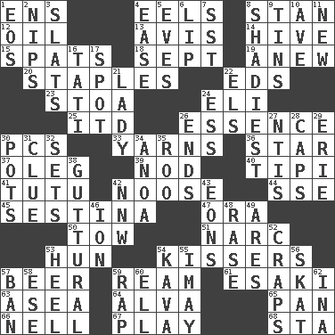 ACROSS 1. Followers of ems 4. Snakelike fish 8. Comedian Laurel of Laurel & Hardy 12. Lubricate 13. Deliberation 14. Hub of activity 15. Arguments over trivial matters 18. Back-to-school mo. 19. Afresh 20. Paper fasteners 22. Begley and Asner 23. Portico 24. Connecticut Ivy Leaguer 25. It would 26. Center 30. Personal Computers (abbr.) 33. Tall tales 36. Play the lead 37. Cassini of fashion 39. Dreamland 40. Native american tent (variation) 41. Ballerina skirt 42. Trap for birds or small mammals 44. Compass dir. 45. French poetic form 47. Mouth or opening 50. Pull behind 51. Drug cop 53. Attila the _ 54. Smoochers 57. Fermented drink made from hops 59. 480, 500 or 516 sheets of paper 61. 1973 Nobel Price Winner (Physics) Leo 63. Toward the sea 64. Inventor's middle name 65. Baking dish 66. 1994 drama film starring Jodie Foster 67. Shaw product 68. R.R. building DOWN 1. Greek goddess of the dawn 2. Pinches, bites 3. Narrow boards 4. Relaxation 5. Nights before holidays 6. Mouth edge 7. Fast jet (abbr.) 8. Most dubious of character or honesty 9. Metal containers 10. "___ Maria" 11. ___ Haven, CT 16. Jacques of French films 17. Specific locale 21. Kenny Rogers chart-topper in '80 22. Raised railways 24. Double-curved letter 26. Extremities 27. Nuclear Threat Initiatives 28. Balmoral and tarboosh 29. One of the Great Lakes 30. Plant holders 31. A slight indication 32. Puts into a specified state 34. Small Philippine buffalo 35. Friend of Pooh 38. From the throat 42. Compass dir. 43. Immeasurably long periods of time 46. Electrically charged atom 48. Raze (variant) 49. Ancient Greek god of war 52. Dice game 53. The bottom of a shoe or boot 54. Polynesian shrub of the pepper family 55. "If ____ say so..." 56. Three-handed card game 57. Bar 58. Compass dir. 59. Reproach for some lapse or misdeed 60. Pipe bend 62. _ tizzy (2 wds.)