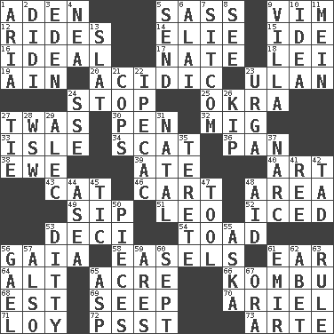 ACROSS 1. Arabian gulf 5. Backtalk 9. Zeal 12. Amusement-park features 14. Writer Wiesel 15. Binary compound 16. Standard of perfection 17. Nathan's nickname 18. Flowery wreath 19. The 18th letter of the Arabic alphabet 20. Being or containing an acid 23. ____ Bator 24. Discontinue 25. Gumbo ingredient 27. It was, poetically 30. Fenced enclosure 32. Russian fighter aircraft 33. Capri or Wight 34. Leave at once 36. Baking dish 38. She-sheep 39. Had dinner 40. Tate display 43. Feline 46. Draw slowly or heavily 48. Length times width 49. Small drink 51. Lion 52. On the rocks 53. Tenth: prefix 54. Frog relative 56. Greek goddess of the earth (variant) 58. Artist's stands 61. Hearing organ 64. The first octave above the treble staff 65. 43,560 square feet 66. Dried seaweed eaten as food 68. Eastern Standard Time (abbr.) 69. Ooze 70. Satellite of Uranus 71. Myrna of the movies 72. Inconspicuous attention getter 73. Johnson of "Laugh-In" DOWN 1. Roberta Peters solo 2. "You Light Up My Life" star Conn 3. Locale of original sin 4. Teachers' org. 5. Post 6. Jai _ 7. "Cheers" or "Ellen" 8. Observe 9. Country residence 10. The content of cognition 11. Count _ (2 wds.) 13. Narrow board 21. 911 reaches them 22. Medicinal drug used to evoke vomiting 23. Capital and largest city of Mongolia 24. Compass dir. 26. Monetary unit of Laos 27. Neckwear 28. Compass dir. 29. Actor Baldwin 31. Brizilian seaport 35. Cigar-shaped 37. Drug cop 41. To separate or throw off 42. Small boy 44. At sea 45. Nervous spasm 47. Utensil 48. Assist 50. Components 53. Short, simple song 55. "____ silly question..." 56. Highlander 57. In addition 59. Ancient Greek god of war 60. Back-to-school mo. 61. Arab leader 62. Collude with 63. Court order 65. Cleo's killer 67. Mouth or opening