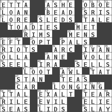 ACROSS 1. Singer James 5. American tennis player Robert 9. Mitch Miller's instrument 13. Grant temporary use of 14. Necklace unit 15. Indian titles of respect 16. Old wives' tales, e.g. 17. Bobsleighs 18. Falsehood 19. Sycophants 21. Was introduced to 22. Basketball hoops 23. Not women's 24. Lizard (obsolete) 27. Choose 28. Friends 29. Debaucheries 31. Curve 32. "Terrible" tsar 36. Water jar 37. A saturated hydrocarbon 38. Short-tailed, large-bodied rat 39. Sew up the eyelids of hawks and falcons 40. Retirement account (abbr.) 41. Exchanges for money 42. Spoils 44. Leather borer 46. Make lace 47. Comedian Laurel of Laurel & Hardy 48. Afternoon social gatherings 50. Automobile 51. Yearning 54. Slanted text style (abbr.) 56. Honor 58. Lacerate 60. Cause heat under the collar 61. Morally bad or wrong 62. Writer Wiesel 63. Oceans 64. Flaplike coverings 65. Kill DOWN 1. Pipe bend 2. A blast of a horn 3. Edible starchy tuberous root 4. Approach 5. Most capable 6. Observes 7. Possessed 8. Begley and Asner 9. Clearly or manifestly demonstrative 10. Naughty children 11. Lubricate 12. Compass dir. 17. Simple or foolish person 20. "Vaya con ____" 21. Cartoonist voice _ Blanc 23. Apple computer (short form) 24. Greek god of love 25. Do some clerical work 26. Lacquered or enameled metalware 28. Before (prefix) 30. Baron Munchausen's specialties 31. Santa ___, CA 33. Electrical Unit 34. Silent film actress Nazimova 35. A home for chicks 37. Nonscientific branch of learning 40. Electrically charged atom 41. Volcanic refuse 43. Boat paddle 44. Ringlike coral islands and reefs 45. Gone 47. Any of the three canals of the cochlea 49. Settings 51. Put down 52. 1994 drama film starring Jodie Foster 53. Greek goddess of the earth (variant) 54. Big collection agency 55. Neckwear 56. Snakelike fish 57. 16 59. Marina Del _, California