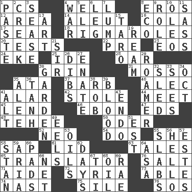ACROSS 1. Personal Computers (abbr.) 4. Not ill 8. Greek god of love 12. Length times width 14. Eskimo relative 16. Root beer relative 17. Dry up 18. Complicated, petty procedures 20. Trials 22. Before (prefix) 23. Greek goddess of the dawn 24. Supplement with great effort 25. Binary compound 28. Boat paddle 30. Smile widely 31. With motion or animation 35. _ moment's notice (2 wds.) 37. Sharp remark 40. Actor Baldwin 41. Having or resembling wings 42. Fur scarf 44. Rendezvous 45. Grant temporary use of 46. Inky black, to poets 47. Begley and Asner 48. Giggle 50. River in Europe 52. Modern: prefix 54. Two (Sp.) 55. A female animal or person 58. Plant excrement 61. Hat (slang) 63. Stories 65. Interpreter 70. Table seasoning 71. Assistant 72. Damascus' land 73. Competent 74. Political cartoonist Thomas 75. Drop; flow; fall 76. Distress signal DOWN 1. Thick mixture 2. Small stream 3. Gospel singer Marvin 4. Armed conflict 5. Biblical high priest 6. Part of a journey 7. Mass 8. Environmental prefix 9. Hero or heavy, e.g. 10. Margarine 11. Backtalk 13. Tate display 15. Pacific island yam 19. 480, 500 or 516 sheets of paper 21. Title for a knight 26. Claim 27. Maternal 29. Wanderer 30. Place where plants grow 32. Downhill vehicle 33. Perceives with the eye 34. Sep. follower 35. Toward shelter 36. Hyperbolic tangent 38. Director Reiner 39. Vital fluid 41. Keyboard modifier key 43. Inside; within (prefix) 49. Snakelike fish 51. Eastern Standard Time (abbr.) 53. Lubricates 55. Broad, flat, thick pieces 56. Phone greeting 57. _____ Park, CO 58. Comedian Laurel of Laurel & Hardy 59. Operatic vocal solo 60. Groovy apts. 62. 24-hour periods 64. White ___ sheet 66. Fish or hair follower 67. Three (prefix) 68. Petroleum 69. Actress Charlotte