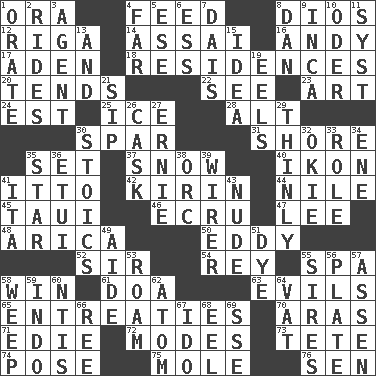ACROSS 1. Mouth or opening 4. Nourish 8. "Vaya con ____" 12. Capital of Latvia 14. Slender Brazilian palm 16. "60 Minutes" Commentator Rooney 17. Arabian gulf 18. Homes 20. Watches over 22. Perceive with the eye 23. Nonscientific branch of learning 24. Eastern Standard Time (abbr.) 25. Frozen water 28. Keyboard modifier key 30. Practice fight 31. Dinah or Pauly 35. Arrange properly for use 37. Overwhelm 40. Image 41. "Tell ____ the Marines!" 42. Japanese brewing company 44. The longest river in the world 45. "Change" in Tahitian 46. Shade of tan 47. Area sheltered from the wind 48. N. Chile seaport 50. Whirlpool 52. Title for a knight 54. Marina Del _, California 55. Health resort 58. Acquire through effort 61. ___ good deed 63. Vices 65. Pleas 70. Ancient river in northeast Turkey 71. Singer Brickell 72. Methods 73. Wig 74. Introduce or present, as a question 75. Undercover agent 76. Elected rep. DOWN 1. Speak pompously 2. Amusement-park features 3. Representative 4. Distant 5. Compass dir. 6. Double-curved letter 7. Raised platform 8. Daniel's nick name 9. South American Indian 10. Baltic tributary 11. System (abbr.) 13. Added to 15. The main thing one is thinking about 19. Snakelike fish 21. Small drink 26. Keg 27. Bert's buddy 29. Without viscosity 30. Unemotional ones 32. Migrant worker of the '30s 33. Hero or heavy, e.g. 34. Compass dir. 35. Play the lead 36. Needle holder 38. The grampus (Milton) 39. One who wires 41. Call ___ day 43. Naked 49. Assistant 51. Color 53. Wander 55. Fathers 56. Food holder 57. NE Netherlands city 58. Shed a tear 59. _ china 60. Nuclear Threat Initiatives 62. Tiny particle 64. Large container 66. Portuguese money of account (variant) 67. Wedding promise 68. Snakelike fish 69. Compass dir.