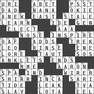 ACROSS 1. RI univ. 4. Collude with 8. Inconspicuous attention getter 12. June honoree 13. Grandmother 14. Migrant worker of the '30s 15. Afresh 17. 90 degrees 18. Showing deterioration from age 19. Acquire or gain knowledge or skills 21. Binary compound 23. Commissioned military rank (abbr.) 24. Choose 26. American Automobile Association (abbr.) 28. Olfactory organ 30. Motivate 34. Clumsy lout 37. Does sums 39. Long journey 40. Lion 41. Remove soap 43. Compass dir. 44. Old wives' tales, e.g. 46. Pulled tight 47. Mayday 48. Short socks 51. Conclusions 54. Madame (abbr.) 55. Composer Copland 58. Health resort 61. Working for oneself (abbr.) 63. One who wires 65. Bake eggs in their shells 67. South American Indian 71. Indian skirt 72. Event that recurs at intervals 73. Path through which fluid escapes 74. Federal power corp. 75. Kill 76. Globular water bottle used in Asia 77. Snakelike fish DOWN 1. Allodial 2. Indian princess (variant) 3. Perfect 4. One (Scot) 5. Sound made by sheep 6. Followers of ems 7. Jacques of French films 8. Cooking vessel 9. Heroin 10. Drop; flow; fall 11. Adolescent 16. Songbird 18. Oceans 20. Non-commissioned officer (abbr.) 22. Daniel's nick name 25. Russian ruler of old 27. Fitting 29. Prepares for publication 30. Come out of 31. Angers 32. Western Nevada city 33. Makes supply last 34. Water jar 35. A really long time 36. Tined utensil 38. Heredity factor (abbr.) 42. Inactive volcano in Sicily 45. Shade tree 49. Arab leader 50. "___ Little Indians" 52. Fool 53. Indian titles of respect 56. Speak pompously 57. Impudent aggressiveness 58. Fast planes 59. Silvers or Donahue 60. Opera by Verdi 62. Deli pickle 64. Monetary unit of Yemen 66. Marina Del _, California 68. Modern: prefix 69. Domesticated feline 70. Alias (abbr.)