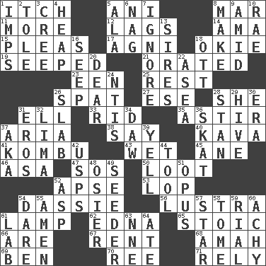 ACROSS 1. Hankering 5. Black tropical American cuckoo 8. Spoil 11. Greater amount 12. Falls behind 14. Nanny (var.) 15. Entreaties 17. Hindu god of fire 18. Migrant worker of the '30s 19. Oozed 21. Declaimed 23. Car or cant ending 25. Repose 26. Petty quarrel 27. Compass dir. 28. A female animal or person 31. Pipe bend 33. To free from 35. Moving about 37. Operatic vocal solo 38. Declare 40. Polynesian shrub of the pepper family 41. Dried seaweed eaten as food 43. Soggy 45. A saturated hydrocarbon 46. White ___ sheet 47. Mayday 50. Spoils 52. Domed church section 53. Trim (branches) 54. Small ungulate mammals of Africa 56. A period of five years 61. Desk light 62. Pulitzer Prize-winning author Ferber 65. Unemotional 66. "We ___ not amused" (Victoria) 67. Monthly bill 68. Housemaid 69. Benjamin's nick name 70. Portuguese money of account (variant) 71. Have trust in DOWN 1. Naughty children 2. Lacquered or enameled metalware 3. Algonquian 4. Pile 5. In the manner of 6. Tired old horse 7. Dismiss 8. Cause to be 9. Among 10. Actress Charlotte 13. Founders of families 16. Ooze 18. Baseball player Mel 20. Letter starter 22. Toward the sea 24. Nuclear Threat Initiatives 26. Thick slice 28. Comedian Laurel of Laurel & Hardy 29. Hub of activity 30. Epoch 31. Greek god of love 32. Pale green bean 34. Simpleton 36. Three-handed card game 37. Alias (abbr.) 39. Shout 42. United States Postal Service (abbr.) 44. Instrument 48. Flexible twig of a willow tree 49. Sowing specialist 51. Musical composition 52. Viper 54. Have the gumption 55. So be it 57. Play the lead 58. Heavy book 59. Monetary unit of Yemen 60. Painful 61. Experiment locale 63. Compass dir. 64. Had dinner
