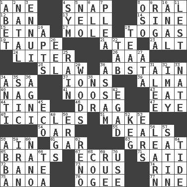 ACROSS 1. One (Scot) 4. Fastener 8. Spoken 12. Prohibit 13. Shout 14. Trig term 15. Inactive volcano in Sicily 17. Undercover agent 18. Ancient Roman robes 19. Grayish beige 21. Had dinner 23. Keyboard modifier key 24. 61 cubic inches 26. American Automobile Association (abbr.) 28. Cole _ (cabbage dish) 30. Refrain by choice 34. White ___ sheet 37. Charged atoms 39. _ mater 40. Tired old horse 41. Trap for birds or small mammals 43. Ingest 44. Prong on a fork 46. To be drawn or hauled along 47. Sight organ 48. Winter's stalactites 51. Cause to be 54. Rowing implement 55. Allots cards 58. The 18th letter of the Arabic alphabet 61. Slender fish 63. Relatively large 65. Naughty children 67. Shade of tan 71. Suttee (variant) 72. Object of repulsion 73. Common sense 74. To free from 75. Small Philippine buffalo 76. Double curve, resembling the letter S 77. Compass dir. DOWN 1. Collude with 2. Brizilian seaport 3. World-weariness 4. Symbol (abbr.) 5. Modern: prefix 6. 100% 7. Entreaty 8. Bear (Spanish) 9. Port city in Latvia 10. Of or related to the anus 11. For fear that 16. Flats, for short 18. Beverages made from leaves 20. Snakelike fish 22. Bar bill 25. Water falling in drops from the sky 27. _ moment's notice (2 wds.) 29. Forest 30. Indian state 31. Toward shelter 32. "If ____ say so..." 33. Nathan's nickname 34. Opposed to 35. Ketch in the Levant 36. Hindu god of fire 38. Or not 42. Mild oath 45. Environmental prefix 49. Falls behind 50. Period 52. Barrel 53. Hearing organs 56. Memorize 57. Smooth fabric 58. Swedish rock group 59. SW Asia republic 60. Billionth: prefix 62. Western Nevada city 64. Event that recurs at intervals 66. Beverage made from leaves 68. Gear tooth 69. Regret 70. Purpose
