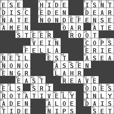 ACROSS 1. Compass dir. 4. Flintstone garb 8. Is not 12. Plate 14. Genesis locale 15. Letter starter 16. Nathan's nickname 17. Unrelated to defense, as in spending 20. So be it 21. Rowing implement 22. Had dinner 23. Navigate 27. Carrot, for example 29. Distinctive style or manner 31. 911 reaches them 34. Chap (slang) 35. One of the Great Lakes 36. Famous astronaut Armstrong 39. Eastern Standard Time (abbr.) 41. At sea 42. Words to Nanette 43. NE Netherlands city 46. Engineer (abbr.) 47. Cowardly lion portrayer 48. 90 degrees 51. Rob, plunder, or pillage 54. Raised railways 56. _ Lanka 58. Lyric poems 61. Rotating or pertaining to rotation 66. Inwardly 67. An important port of Yemen 68. Medicinal plant 69. Raised platform 70. Periodic rise and fall of the sea level 71. Cuts off 72. Arrange properly for use DOWN 1. Pulitzer Prize-winning author Ferber 2. Thailand, formerly 3. _____ Park, CO 4. Layer 5. Wedding promise 6. Lair 7. Inside; within (prefix) 8. Binary compound 9. Legislators 10. Political cartoonist Thomas 11. Family _ (genealogy) 13. Penny 18. Hearing organ 19. Back 24. Night before a holiday 25. Snakelike fish 26. Cause heat under the collar 28. Sea 30. Rhinal 32. Sliced dessert 33. Ocean 34. Plants 36. Compass dir. 37. Age 38. Swallowed 40. Russian ruler of old 44. A female animal or person 45. Epoch 49. Fast jet (abbr.) 50. Three (prefix) 52. Nothingness 53. Ferber et al. 54. Part of Q.E.F. 55. Farming town in central California 57. "Terrible" tsar 59. Writer Wiesel 60. System (abbr.) 62. One (Scot) 63. Connecticut Ivy Leaguer 64. Trim (branches) 65. Consenting reply