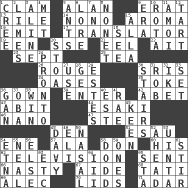 ACROSS 1. Dollar (slang) 5. Actor Alda or Thicke 9. Part of Q.E.F. 13. Cause heat under the collar 14. Words to Nanette 15. Scent 16. Give off 17. Interpreter 19. Car or cant ending 20. Compass dir. 21. Snakelike fish 22. Small island 23. Back-to-school mo. 25. Afternoon social gathering 26. Makeup applied to the cheeks 30. Indian titles of respect 34. Fertile tracts in a desert 35. Puff or smoke 36. Bride's dress 39. Keyboard key 42. Collude with 43. "This won't hurt ____!" 44. 1973 Nobel Price Winner (Physics) Leo 46. Billionth: prefix 47. Navigate 48. Lair 51. He sold his birthright 54. Compass dir. 57. According to 58. Spanish title 60. Part of HMS, perhaps 62. Boob tube 65. Transmitted 66. Offensive 67. Assistant 68. Jacques of French films 69. Actor Baldwin 70. Hats (slang) 71. The sixth month of the Jewish calendar DOWN 1. Algonquian 2. Citrus fruits 3. Place in a line 4. Was introduced to 5. Pismires 6. Old wives' tales, e.g. 7. Santa ___, CA 8. Music written for nine 9. Period 10. Round or rotation of duties 11. Mine, in Marseilles 12. Small pie 15. Silent film actress Nazimova 18. Perceive with the eye 20. Portico 24. Right away 27. Purpose 28. Commissioned mil. rank 29. _____ Park, CO 30. Flight of steps 31. Director Reiner 32. Mamie's mate 33. Put into a specified state 36. Separate the seeds from cotton 37. Chief or king in Benin or Nigeria 38. Acquire through effort 40. Eastern Standard Time (abbr.) 41. Actress Charlotte 45. Peachy ____! 48. _ Jones' Locker 49. Connecticut Ivy Leaguer 50. Relating to the nose 52. Having the leading position 53. National forest in Provo, Utah 54. Inactive volcano in Sicily 55. Be tempered by heat 56. Otherwise 58. Texas town _ City 59. Singles 61. Move through with a circular motion 63. And so on (abbr.) 64. One more than two 65. R.R. building