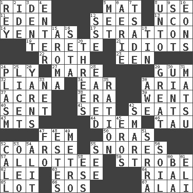 ACROSS 1. Travel on or in a vehicle 5. Floor covering 8. Purpose 11. Genesis locale 12. Perceives with the eye 13. Non-commissioned officer (abbr.) 14. Gossips 17. Ski resort town in Vermont 19. Cigar-shaped 21. Foolish or stupid persons 22. Writer of Portnoy's Complaint (1969) 23. Car or cant ending 24. Strand of rope, yarn or thread 27. Female horse 29. Chewing product 32. Woody, climbing, usually tropical plant 34. Ewer handle 36. Roberta Peters solo 37. Land measure 38. Period 39. Gone 40. Posted 41. Arrange properly for use 42. Theater features 43. Mountains (abbr.) 44. South Vietnam president (1954) 46. The 19th letter of the Greek alphabet 47. Opposite of masc. 50. Mouths or openings 52. Rough 55. Sounds asleep 57. One to whom something is allotted 59. Disco prop 62. Flowery wreath 63. Celtic language 64. Monetary unit of Yemen 65. Car dealer's back yard 66. Mayday 67. Jai ____ DOWN 1. Marina Del _, California 2. Binary compound 3. Scratch 4. Keyboard key 5. Was introduced to 6. Nest on high 7. Sadhe (variant) 8. To (old English) 9. Highlander 10. Immeasurably long periods of time 12. Compass dir. 15. Scent 16. Bristle 18. Metal container 20. Triplets 24. Suffix with ecto or cyto 25. It is permitted: Lat. 26. Entertaining tales 28. Having ears or earlike features 29. Relatively large 30. National forest in Provo, Utah 31. Taiwanese island in East China Sea 33. Fish or hair follower 35. Food allowance for one day 36. Deep reverence 42. Don Adams' spy role 45. Greek god of love 47. Back 48. _____ Park, CO 49. Paris' subway 51. Spanish missionary in California 52. Give a ring to 53. Margarine 54. Set down 55. Perceive with the eye 56. Land 58. Curvy letter 60. Sound made by sheep 61. Biblical high priest