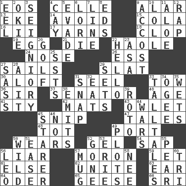 ACROSS 1. Greek goddess of the dawn 4. Cell (Danish) 9. Having or resembling wings 13. Make supply last 14. Prevent from happening 15. Root beer relative 16. Cards in a Roman deck? 17. Entertaining tales 18. Hoof sound 19. Oval reproductive body of a fowl 21. Pass on 22. White Person, in Hawaii 24. Characteristic smell of wine 26. Double-curved letter 27. Travel by water 29. Narrow board 30. Upward 31. Stitch closed the eyes of (a falcon) 33. Pull behind 36. Title for a knight 37. Legislator 40. Personal question 41. Filthy place 42. Floor protectors 43. A small or young owl 45. Clip 47. Falsehoods 48. Small child 49. Left side of a ship or aircraft 50. Erodes 52. Set 54. Plant excrement 56. One who doesn't tell the truth 57. Person of subnormal intelligence 59. Allow 61. Otherwise 62. Join together 63. Ewer handle 64. Baltic tributary 65. Honkers 66. Indian title of respect (Mr.) DOWN 1. Snakelike fish 2. Migrant worker of the '30s 3. Signiory (variant) 4. Island 5. Elude 6. Australian parrot (variant) 7. Actor's bit 8. Begley and Asner 9. Buttonhole 10. Hang loosely or laxly 11. Medicinal plant 12. Strike 20. Eighteen holes 22. Phone greeting 23. White ___ sheet 25. Fast planes 27. Backtalk 28. Set down 29. Arranges properly for use 31. Fastener 32. Consume 33. Baron Munchausen's specialties 34. Double curve, resembling the letter S 35. Soaks 38. Gives off 39. Printing process, for short 44. Armed conflicts 45. A viewer who gazes fixedly 46. Or not 49. Small pieces of grounds 50. Rampant 51. Comfort 52. Went 53. 4th largest of the Great Lakes 55. Lightbulb-shaped fruit 56. Lion 57. Java container 58. Born 60. Three (prefix)