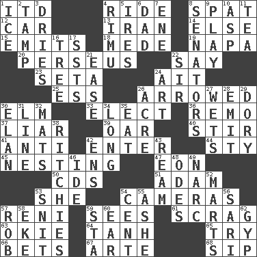 ACROSS 1. It would 4. Travel on or in a vehicle 8. Petty quarrel 12. 4-wheeled motor vehicle 13. SW Asia republic 14. Otherwise 15. Sends forth 18. Ancient Persian 19. California wine valley 20. Son of Zeus who helped slay Medusa 22. Declare 23. Stalk of a moss capsule 24. Small island 25. Curvy letter 26. Moved like an arrow 30. Shade tree 33. Choose 36. San ____ (Riviera town) 37. One who doesn't tell the truth 39. Boat paddle 40. Agitate 41. Opposed to 42. Keyboard key 44. Filthy place 45. Inhabiting a nest 47. Period of immesurable duration 50. Music discs 51. First man 53. A female animal or person 54. Devices for capturing images 57. Painter Guido (1575-1642) 59. Perceives with the eye 61. Lean end of the neck 63. Migrant worker of the '30s 64. Hyperbolic tangent 65. Attempt 66. Stakes 67. Johnson of "Laugh-In" 68. Small drink DOWN 1. Frozen water 2. Pack (down) 3. Frees from moisture 4. Tall New Zealand timber tree 5. Angers 6. Male parent 7. Compass dir. 8. Legislators 9. Shaw product 10. Viper 11. Beverage made from leaves 16. Woody plant 17. Fast planes 21. Comfort 22. Title for a knight 24. Nonscientific branch of learning 26. Land measure 27. Moistens 28. Send forth 29. Dinghy 30. Liveliness 31. Actor's bit 32. Floor coverings 34. Having great length 35. Ingest 38. Actors Guy, Robert Welles, and Clint 42. Followers of ems 43. 480, 500 or 516 sheets of paper 46. Binary compound 48. Lyric poems 49. Drug cop 52. Shops 53. In a ____ (agitated or irritated) 54. Penny 55. American tennis player Robert 56. Indian skirt 57. Director Reiner 58. Make supply last 59. R.R. building 60. Ewer handle 62. Hustle