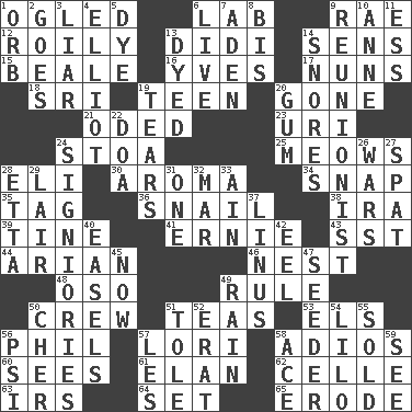 ACROSS 1. Stared at amorously 6. Experiment locale 9. Actress Charlotte 12. Agitated, as a liquid 13. "You Light Up My Life" star Conn 14. Elected reps. 15. Memphis, Tenn. Street 16. Jacques Cousteau's middle name 17. Religious women 18. _ Lanka 19. Adolescent 20. Went 21. Wrote a lyric poem 23. RI univ. 24. Portico 25. Catcalls? 28. Connecticut Ivy Leaguer 30. Odor 34. Fastener 35. Label 36. Slow-paced one 38. Lyricist Gershwin 39. Prong on a fork 41. Bert's buddy 43. Fast jet (abbr.) 44. Believer in; advocate of (suffix) 46. A home for chicks 48. Bear (Spanish) 49. General guideline 50. Ship's personnel 51. Beverages made from leaves 53. Raised railways 56. Silvers or Donahue 57. Australian parrot (variant) 58. Goodbye (Sp.) 60. Perceives with the eye 61. Enthusiasm 62. Cell (Danish) 63. Big collection agency 64. Arrange properly for use 65. Eat (away) DOWN 1. Globe 2. Travels 3. One who doesn't tell the truth 4. American author Paul (1891-1958) 5. Color 6. Not recorded 7. Arabian gulf 8. Altar cloth linen 9. One who advocates reunion 10. Queen of England 1702-14 11. Double-curved letter 13. Colored 14. Sounds asleep 19. Lacerates 20. Chewing product 22. ___ good deed 24. Seigniories (variant) 26. Armed conflicts 27. Argument over a trivial matter 28. Singer James 29. Den 31. Single 32. Spoil 33. The 18th letter of the Arabic alphabet 37. "_ and Lucy" (Charlie Brown theme song) 40. Artist's stands 42. Snakelike fish 45. At this time 47. Sowing specialist 49. Precipitation 50. "Mermaids" star 51. Lacquered or enameled metalware 52. Part of Q.E.F. 54. _ and Stitch 55. Exchanged or delivered for money 56. Air pressure measure (abbr.) 57. French article 58. Adept person 59. Perceive with the eye