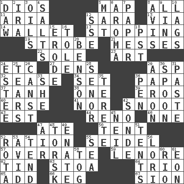 ACROSS 1. "Vaya con ____" 5. Atlas unit 8. Everything 11. Operatic vocal solo 12. "Two Mules for Sister ____" 13. By way of 14. Place for singles 17. Closing up, plugging up 19. Disco prop 21. Makes clutter 22. Not divided or shared with others 23. Nonscientific branch of learning 24. And so on (abbr.) 27. Lairs 29. Cleo's killer 32. Gospel singer Marvin 34. Arrange properly for use 36. Dad 37. Hyperbolic tangent 38. Single 39. Greek god of love 40. Celtic language 41. And not 42. Snout, nose 43. Eastern Standard Time (abbr.) 44. Former U.S. Attorney General Janet 46. Compass dir. 47. Had dinner 50. Portable shelter 52. Food allowance for one day 55. A glass for beer 57. Make much ado about nothing 59. Poe poem 62. Metal container 63. Portico 64. Musical group of three 65. Find the sum of 66. Cask 67. The Jewish people; Israel DOWN 1. Obsolete 2. Lyricist Gershwin 3. Petroleums 4. Table seasonings 5. Floor covering 6. Odor 7. Some stationery 8. Deliberation 9. Actor's bit 10. Falls behind 12. Compass dir. 15. Wear away 16. Lacquered or enameled metalware 18. Pacific Standard Time (abbr.) 20. Gillaume's butler role 24. First name in cosmetics 25. Pulls apart 26. 2nd pers. sing. pres. of can (arch.) 28. Sir (Sp.) 29. Composer Copland 30. Soup utensil 31. Thick mixture 33. A female animal or person 35. Cigar-shaped 36. Animal enclosure 42. Something which is sent 45. Famous astronaut Armstrong 47. Wind 48. Cod relative 49. Related on the mother's side 51. Portable shelters 52. Round or rotation of duties 53. Enthusiastic 54. Look after 55. Ocean 56. Australian parrot (variant) 58. Coat; cloak 60. River (Sp.) 61. Age
