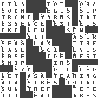 ACROSS 1. Inactive volcano in Sicily 5. Small child 8. Mouth or opening 11. Within a short period 12. The front part of a cuirass 14. Small drink 15. Heavy duty weighing machine 17. Tall tales 18. Make lace 19. Center 21. Eastern Standard Time (abbr.) 22. Raised railways 23. Supplement with great effort 24. Lair 25. Elected rep. 27. Be seated 28. SW Saudi Arabia district 31. Oceans 35. Not strict 37. Hoop that covers a wheel 38. Relaxation 39. _-fi 41. Nights before holidays 42. Celtic language 43. Binary compound 45. Egg locale 46. Clip 47. Big collection agency 49. Symbol (abbr.) 51. Lubricate 52. Lion 55. Fish or hair follower 57. White ___ sheet 60. Pulling apart 62. "One Day ___ Time" 63. Founders of families 65. "_____ Recall" 66. Player for Phoenix 67. Unclean, religiously 68. False hair 69. Teat (slang) 70. Erode 71. Ancient Greek god of war DOWN 1. First name in cosmetics 2. Cod relative 3. Trap for birds or small mammals 4. Queen of England 1702-14 5. Afternoon social gathering 6. Legendary monster 7. Airtight sealed metal containers 8. Clearly or manifestly demonstrative 9. Monetary unit of Yemen 10. Tenement units (abbr.) 13. Fast planes 16. Extremities 17. Gossips 20. To provide with a ceiling 26. Ingested 29. Angers 30. Relief 31. Observes 32. Merit 33. Aide 34. Not well drained, as in land 36. One more than ninety 40. Foolish or stupid persons 44. One of the Great Lakes 48. Narrow board 50. Vertical spar for supporting sails 52. 61 cubic inches 53. Related on the mother's side 54. Stares 55. Political cartoonist Thomas 56. Needle case 58. Beget 59. Type of rug 61. Roll call or roster of names 64. Bank Draft (abbr.)
