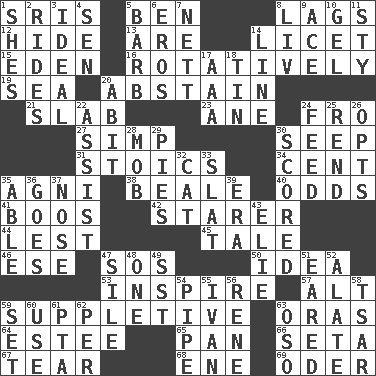 ACROSS 1. Indian titles of respect 5. Benjamin's nick name 8. Falls behind 12. Flintstone garb 13. "We ___ not amused" (Victoria) 14. It is permitted: Lat. 15. Paradise 16. Rotating or pertaining to rotation 19. Ocean 20. Choose not to consume 21. Thick slice 23. One (Scot) 24. Back 27. Simple or foolish person 30. Ooze 31. Unemotional ones 34. Penny 35. Hindu god of fire 38. Calif. Air Force Base 40. Probability 41. Expressions of contempt or scorn 42. A viewer who gazes fixedly 44. For fear that 45. Falsehood 46. Compass dir. 47. Distress signal 50. It may be bright or harebrained 53. Stimulate to action 57. The first octave above the treble staff 59. Supplying deficiencies 63. Mouths or openings 64. First name in cosmetics 65. Baking dish 66. Bristle 67. Pull apart 68. Compass dir. 69. River in Europe DOWN 1. "______ My Girl" (Turtles hit) 2. Amusement-park features 3. Standard of perfection 4. Elected rep. 5. Sharp remark 6. Greek god of love 7. Remaining after all deductions 8. 54 in ancient Rome 9. Adept person 10. Set 11. Filthy place 14. Actor's bit 17. Auto club (abbr.) 18. Metal container 20. "This won't hurt ____!" 22. Help 24. Nourish 25. Tear apart 26. Chooses 28. Crowd into 29. Sliced desserts 30. Tallied 32. Domesticated feline 33. Narrow board 35. Competent 36. Moves 37. Olfactory organ 39. Epoch 43. Writer Wiesel 47. Filth; sediment 48. Single 49. Fast jet (abbr.) 51. Having ears or earlike features 52. Having winglike extensions 54. Corncob 55. "Terrible" tsar 56. French philosopher Descartes 58. Russian ruler of old 59. Put into a specified state 60. Purpose 61. Parent Teacher Assoc. 62. For each 63. Bear (Spanish)