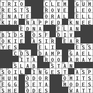 ACROSS 1. Musical group of three 5. Clement's nick name 9. Chewing product 12. Musical pauses 14. Be footloose 15. Lion 16. Maternal 17. Relating to the mouth 18. Pipe bend 19. Apertif with cassis 20. Slept 23. Leg joint 24. Pulitzer Prize-winning author Ferber 25. Style 27. Auction offers 30. Order of Saint Francis (abbr.) 32. HTML Container Element 33. Migrant worker of the '30s 34. SW Saudi Arabia district 36. Hearing organ 38. Affirmative reply 39. Connecticut Ivy Leaguer 40. Double-curved letter 43. Music discs 46. Moist 48. Highlander 49. Call ___ day 51. Friend of Pooh 52. Like ___ of sunshine 53. Thick slice 54. Comedian Laurel of Laurel & Hardy 56. Land 58. Swallow 61. Viper 64. Attila the _ 65. Scent 66. Leaves out 68. Oval reproductive body of a fowl 69. Stalk of a moss capsule 70. Methods 71. A female animal or person 72. Lyric poems 73. Electrical Unit DOWN 1. Long journey 2. Painter Guido (1575-1642) 3. Austrian river, tributary to the Danube 4. Baseball player Mel 5. Riding implement 6. Old wives' tales, e.g. 7. Dodged 8. Cartoonist voice _ Blanc 9. American astronaut and politician John 10. Ubangi River tributary 11. Undercover agent 13. Post 21. Small Philippine buffalo 22. Went by 23. Polynesian shrub of the pepper family 24. Compass dir. 26. Falsehood 27. Male child 28. Mamie's husband 29. Plate 31. Having threads 35. Full of chinks, cracks, or crevices 37. Buttocks 41. Ocean 42. Roguish 44. Deli pickle 45. R.R. building 47. Cooking vessels 48. Separate the seeds from cotton 50. Tolerated 53. Burn superficially 55. Smallest unit of an element 56. "______ My Girl" (Turtles hit) 57. Ending for "Through" and "Enough" 59. Brief written record 60. Pate de foie ____ 61. Opera by Verdi 62. Proofreading order 63. Inconspicuous attention getter 65. Bear (Spanish) 67. Cut the grass