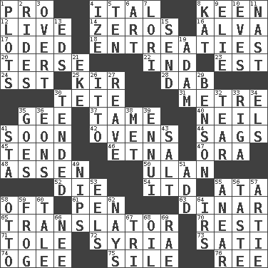 ACROSS 1. Adept person 4. Slanted text style (abbr.) 8. Peachy ____! 12. Moving, as bait 14. Nothings 16. Inventor's middle name 17. Wrote a lyric poem 18. Pleas 20. Laconic 22. Working for oneself (abbr.) 23. Eastern Standard Time (abbr.) 24. Fast jet (abbr.) 25. Apertif with cassis 28. Pat or tap gently 30. Wig 31. Distance measurement (Brit.) 35. Turn to the right 37. Not wild 40. Famous astronaut Armstrong 41. Within a short period 42. Baking chambers 44. Settles 45. Watch over 46. Inactive volcano in Sicily 47. Mouth or opening 48. NE Netherlands city 50. Uhlan (variant) 52. Expire 54. It would 55. "One Day ___ Time" 58. Often (poetically) 61. Fenced enclosure 63. Middle Eastern gold or silver currency 65. Interpreter 70. Repose 71. Lacquered or enameled metalware 72. Damascus' land 73. Suttee (variant) 74. Double curve, resembling the letter S 75. Filth; sediment 76. Portuguese money of account (variant) DOWN 1. Ground plans 2. Amusement-park features 3. Unconcealed 4. Ending with capital 5. Nine, plus one 6. Nonscientific branch of learning 7. Australian parrot (variant) 8. Krazy ___ of comics 9. Writer Wiesel 10. Nights before holidays 11. Political cartoonist Thomas 13. Begley and Asner 15. Transmit 19. First man 21. Make supply last 26. "Tell ____ the Marines!" 27. Break or tear apart 29. Gillaume's butler role 30. Looked after 32. Pull apart 33. Port city in Latvia 34. Raised railways 35. Travels 36. Immeasurably long periods of time 38. Was introduced to 39. World-weariness 41. R.R. building 43. Table seasoning 49. Cuts off 51. Increase 53. Snakelike fish 55. Approach 56. Clothes sense 57. Nick name for Arthur 58. "Beetle Bailey" pooch 59. Tree-dwelling hopper 60. Story 62. Negative votes 64. Big collection agency 66. Born 67. Three (prefix) 68. Lubricate 69. Actress Charlotte