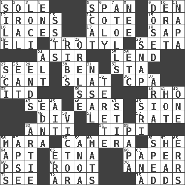 ACROSS 1. Not divided or shared with others 5. Connect, as a bridge 9. Lair 12. Metal shackles 14. ____ d'Azur (French Riviera) 15. Mouth or opening 16. Shoestrings 17. _ vera 18. Plant excrement 19. Connecticut Ivy Leaguer 20. Trinitrotoluene 23. Stalk of a moss capsule 24. SW Saudi Arabia district 25. Grant temporary use of 27. Stitch closed the eyes of (a falcon) 30. Benjamin's nick name 32. R.R. building 33. Patter 34. Narrow board 36. Tax preparer (abbr.) 38. It would 39. Compass dir. 40. 17th letter of the Greek alphabet 43. Ocean 46. Hearing organs 48. The Jewish people; Israel 49. HTML Container Element 51. Allow 52. Pace 53. Against 54. Native american tent (variation) 56. Hindu Mythology: god of death 58. Device for capturing images 61. A female animal or person 64. Fitting 65. Inactive volcano in Sicily 66. Some stationery 68. 23rd letter of the Greek alphabet 69. Carrot, for example 70. Approach 71. Perceive with the eye 72. Ancient river in northeast Turkey 73. Does sums DOWN 1. Drop; flow; fall 2. Of the mouth 3. Locales 4. Compass dir. 5. Scram, to a cat 6. More than one (prefix) 7. Ringlike coral islands and reefs 8. Born 9. Administered medicine 10. Part of Q.E.F. 11. California wine valley 13. Fast planes 21. Chest bones 22. Threatening words 23. Fastener 24. Keyboard modifier key 26. And so on (abbr.) 27. _-fi 28. Ingest 29. Conclusions 31. Rhinal 35. Cigar-shaped 37. Operatic vocal solo 41. Being at a high temperature 42. Single 44. Pulitzer Prize-winning author Ferber 45. Small island 47. Commotion 48. _ Lanka 50. Winning man's name 53. Nick name for Arthur 55. Dad 56. Atlas contents 57. Domed church section 59. Small Philippine buffalo 60. Floor protectors 61. Hurried 62. Froth on beer 63. Blunders 65. Epoch 67. Santa ___, CA