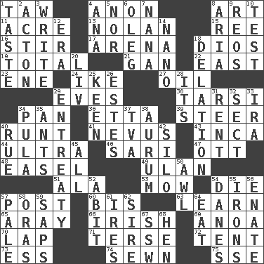 ACROSS 1. The 23rd letter of the Hebrew alphabet 4. Soon (poet.) 8. Tate display 11. Measure of real estate 13. Pitcher Ryan 15. To sift 16. Agitate 17. Sports stadium 18. "Vaya con ____" 19. Add up to 21. Separate the seeds from cotton 22. Compass direction 23. Compass dir. 24. Eisenhower's nickname 27. Petroleum 29. Nights before holidays 30. Tarsus (plural) 34. Baking dish 36. Singer James 39. Bull 40. The smallest animal of a litter 41. Congenital growth or mark on the skin 43. South American Indian 44. Extreme 46. Indian skirt 47. Baseball player Mel 48. Artist's stand 49. Uhlan (variant) 51. Chicken ___ king 53. Cut the grass 54. Pass on 57. Mail 60. Altar cloth linen 63. Memorize 65. Like ___ of sunshine 66. From or relating to Ireland 69. Small Philippine buffalo 70. Pet locale 71. Laconic 72. Portable shelter 73. Curvy letter 74. Stitched 75. Compass dir. DOWN 1. Clothes sense 2. NE Massachussets city 3. Compose 4. Santa ___, CA 5. Or not 6. Cassini of fashion 7. Grandmother 8. Roberta Peters solo 9. Vintage cars 10. Trial 12. Period 14. Billionth: prefix 18. Conveyance 20. 54 in ancient Rome 25. Peachy ____! 26. _____ Park, CO 28. ___ a Wonderful Life 29. Plea 31. Monthly bill 32. Religious group 33. Retirement account (abbr.) 34. Monetary unit of Botswana 35. Pismires 37. Federal power corp. 38. Gold (Symbol: Au) 40. Sorrow 42. Grain storage tower 45. 100% 50. Leather borer 52. "This won't hurt ____!" 54. Natives or inhabitants of Denmark 55. Removes the wrinkles 56. Related on the mother's side 57. Diluted with white 58. Mouths or openings 59. Plant excrements 61. Angers 62. Father 64. Erode 67. Compass dir. 68. Layer
