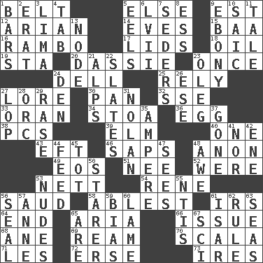ACROSS 1. Waist strap 5. Otherwise 9. Eastern Standard Time (abbr.) 12. Believer in; advocate of (suffix) 14. Nights before holidays 15. Sound made by sheep 16. Role for Stallone 17. Flaplike coverings 18. Lubricate 19. R.R. building 20. Small ungulate mammals of Africa 23. At one time in the past 24. Small valley 25. Have confidence or faith in 27. Old wives' tales, e.g. 30. Baking dish 32. Compass dir. 33. Northwest Algerian city 34. Portico 36. Oval reproductive body of a fowl 38. Personal Computers (abbr.) 39. Shade tree 40. Single 43. Lizard (obsolete) 46. Plant excrements 48. Soon (poet.) 49. Greek goddess of the dawn 51. Born 52. We are 53. Remaining after all deductions 54. French philosopher Descartes 56. Saudi Arabian king (1953-1964) 58. Most capable 61. Big collection agency 64. Conclude 65. Roberta Peters solo 66. Come out of 68. One (Scot) 69. 480, 500 or 516 sheets of paper 70. Any of the three canals of the cochlea 71. French article 72. Celtic language 73. Angers DOWN 1. Long, evenly shaped pieces 2. Part of Q.E.F. 3. Pale green bean 4. Keyboard key 5. Snakelike fish 6. 57 in ancient Rome 7. Spring feasts 8. Double-curved letter 9. Dark wood 10. Ketch in the Levant 11. Falsehood 13. Thickened enlargement 21. High mountains 22. Chalkboards 23. Cassini of fashion 24. Lair 26. Compass dir. 27. Trim (branches) 28. The grampus (Milton) 29. Raze (variant) 31. Pitcher Ryan 35. Electrical Unit 37. Went 41. Or not 42. Compass dir. 44. Nourish 45. Small child 47. Observes 48. Deep reverence 50. A viewer who gazes fixedly 53. Unclothed pictures 55. Nuclear Threat Initiatives 56. Lick closed 57. Queen of England 1702-14 59. Prejudice 60. Unable to walk 61. Austrian river, tributary to the Danube 62. General guideline 63. Oceans 65. "We ___ not amused" (Victoria) 67. _-fi