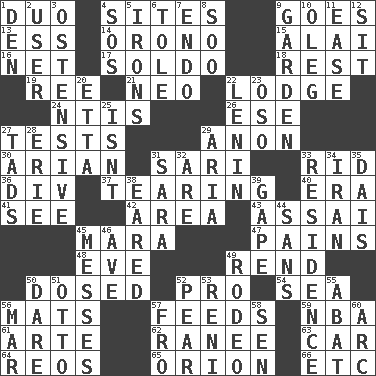 ACROSS 1. Superhero pair 4. Settings 9. Moves 13. Curvy letter 14. U. of Maine site 15. Mountain range southwest of Kyrgyzstan 16. Fish or hair follower 17. Twentieth part of a lira 18. Take ten 19. Portuguese money of account (variant) 21. Modern: prefix 22. Cabin 24. Nuclear Threat Initiatives 26. Compass dir. 27. Trials 29. Soon (poet.) 30. Believer in; advocate of (suffix) 31. Indian skirt 33. To free from 36. HTML Container Element 37. Pulling apart 40. Epoch 41. Observe 42. Type of rug 43. Slender Brazilian palm 45. Hindu Mythology: god of death 47. Aches 48. Night before a holiday 49. Tear apart 50. Administered medicine 52. Adept person 54. Ocean 56. Floor coverings 57. Eats 59. Basketball assoc. 61. Johnson of "Laugh-In" 62. Indian princess (variant) 63. Auto 64. Vintage cars 65. Constellation of myth 66. And so on (abbr.) DOWN 1. Lair 2. One who makes use of a thing 3. Clearly or manifestly demonstrative 4. Distress signal 5. Metal shackles 6. Lacquered or enameled metalware 7. Inside; within (prefix) 8. "Barney Miller" actor Jack 9. Place where plants grow 10. Cassini of fashion 11. Relaxation 12. Be seated 20. Singer James 22. Soviet premier 1918-24 23. Bear (Spanish) 25. Is not 27. Small amounts or degrees 28. 4th largest of the Great Lakes 29. Operatic vocal solo 31. "Two Mules for Sister ____" 32. "We ___ not amused" (Victoria) 33. Home 34. SW Asia republic 35. Raised platform 38. Having ears or earlike features 39. Yawn 44. Without 45. Makes clutter 46. "___ Maria" 49. Cowboy competition 50. Have the gumption 51. "Beetle Bailey" pooch 52. Lightbulb-shaped fruit 53. Painter Guido (1575-1642) 55. Blind as ____ 56. Third mo. 57. Back 58. Elected rep. 60. Curve