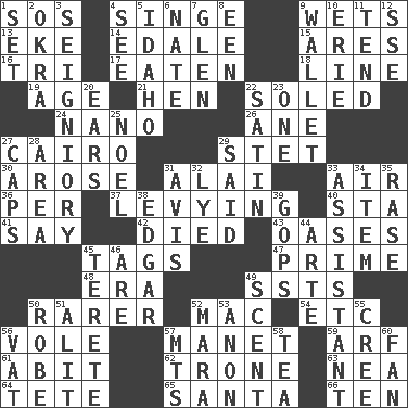 ACROSS 1. Distress signal 4. Scorch 9. Soaks 13. Make supply last 14. Peak District village in England 15. Ancient Greek god of war 16. Three (prefix) 17. Ingested 18. Actor's bit 19. Personal question 21. Layer 22. Having a sole or soles 24. Billionth: prefix 26. One (Scot) 27. Capital of Egypt 29. Proofreading order 30. Came up 31. Jai _ 33. Wind 36. For each 37. Imposing or collecting, as a tax 40. R.R. building 41. Declare 42. Passed on 43. Fertile tracts in a desert 45. Labels 47. First class 48. Period 49. Fast planes 50. More uncommon 52. Big _ 54. And so on (abbr.) 56. Grand slam 57. French painter Edouard 59. Sandy's bark 61. "This won't hurt ____!" 62. Marketplace scale 63. Teachers' org. 64. Wig 65. Before Barbara or Clara 66. Nine, plus one DOWN 1. Put into a specified state 2. Gumbo ingredient 3. Signiory (variant) 4. Observe 5. Potato state 6. Nathan's nickname 7. Small, secluded valley 8. Car or cant ending 9. Place for singles 10. 4th largest of the Great Lakes 11. Look after 12. Compass dir. 20. Hearing organs 22. Smooth fabric 23. Single 25. Christmas carol 27. Smile enhancers 28. Type of rug 29. Stated 31. Opinion 32. Potassium hydroxide 33. Helper 34. A distinct part 35. Raze (variant) 38. _ Allan Poe 39. Republicans 44. Johnson of "Laugh-In" 45. Cigar-shaped 46. "We ___ not amused" (Victoria) 49. Aroma 50. Loose flowing garment 51. Set down 52. Hindu Mythology: god of death 53. Soon (poet.) 55. Algonquian 56. Large container 57. Mountains (abbr.) 58. Afternoon social gathering 60. Air blower